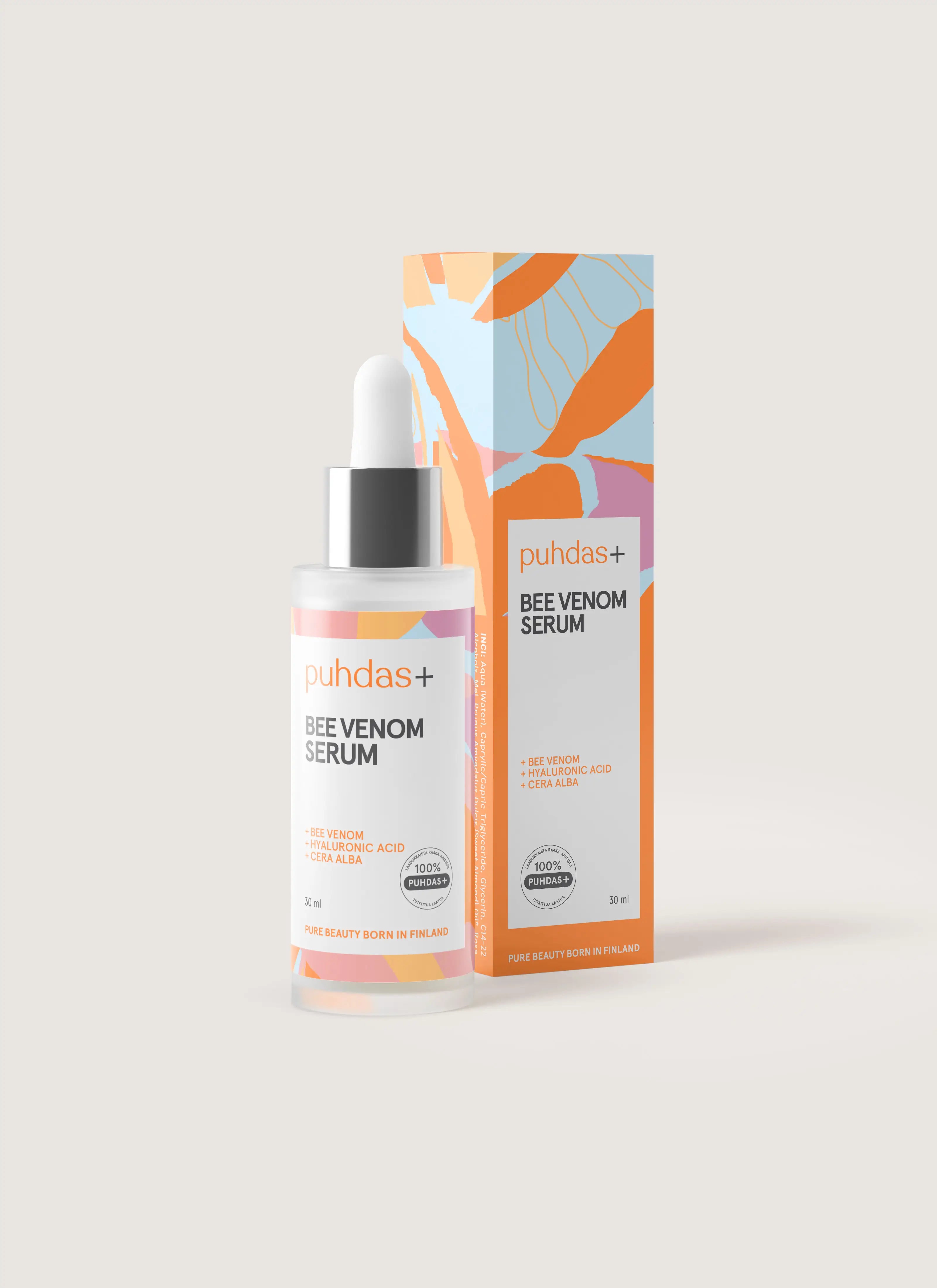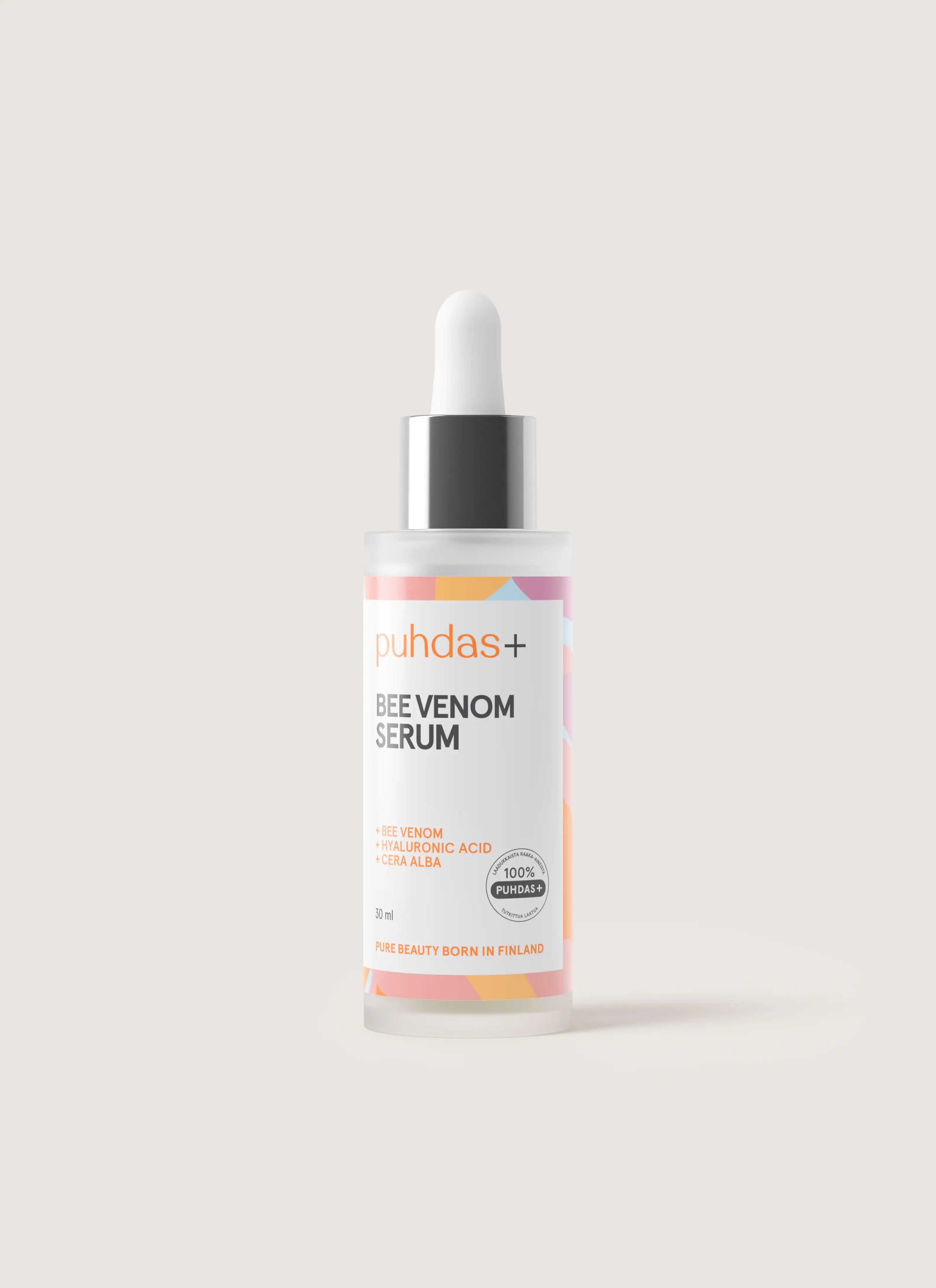 Puhdas+ Bee venom seerumi kosteuttaa, tasoittaa ryppyjä ja sileyttää ihoa luonollisesti. Se myös ravitsee ja uudistaa kudoksia. Bee Venom eli mehiläisen myrkky on täysin luonnollinen keino häivyttää ihon ikääntymisen merkkejä. Bee Venomin vaikutus perustuu sen ylivoimaiseen kykyyn tehostaa elimistön omaa kollageenin ja elastiinin tuotantoa. Seerumi sisältää Bee Venomin lisäksi tehoaineena hyaluronihappoa, joka pystyy sitomaan itseensä tuhatkertaisesti oman painonsa verran vettä. Iän myötä hyaluronihapon määrä iholla vähenee. Valmistettu Suomessa.