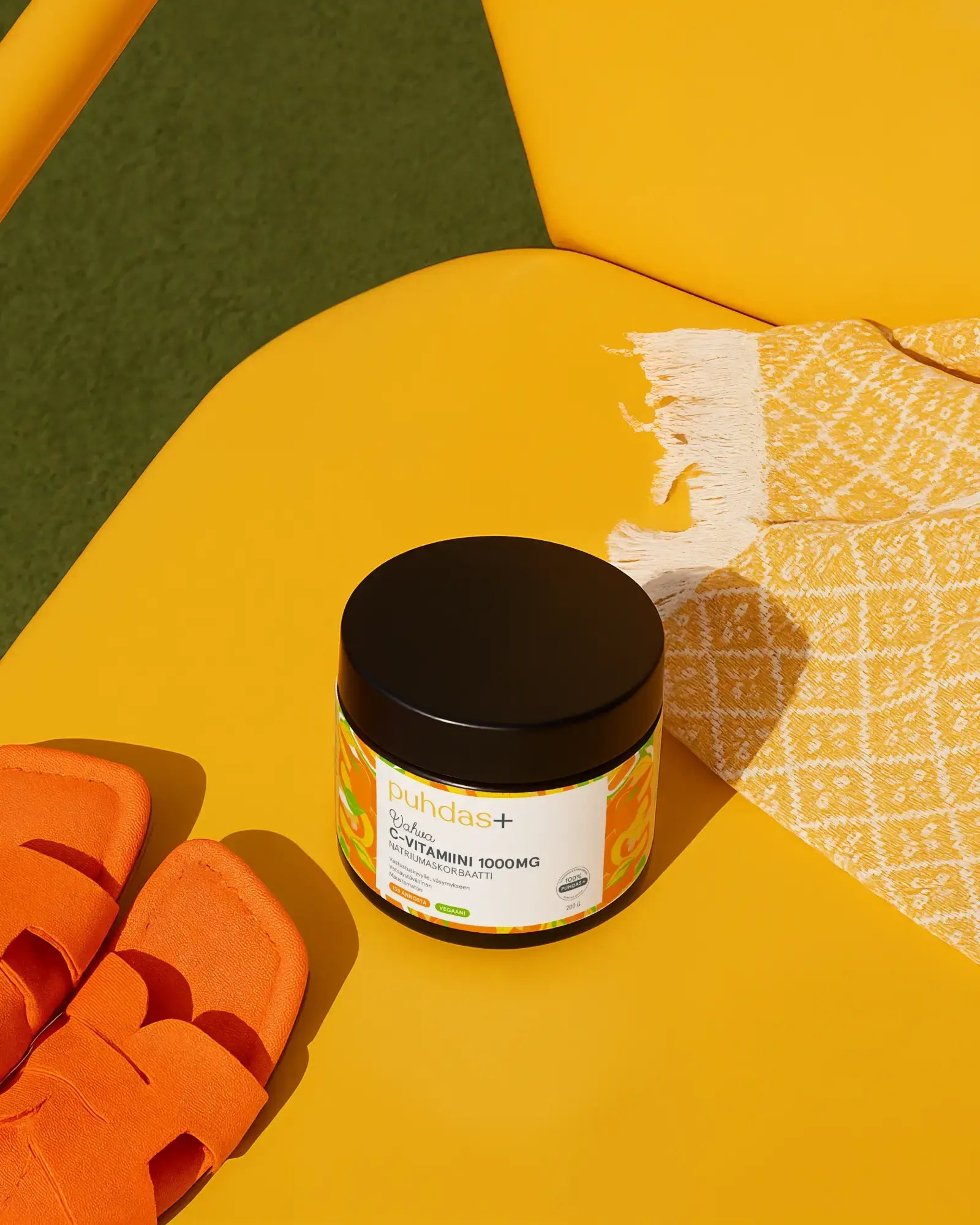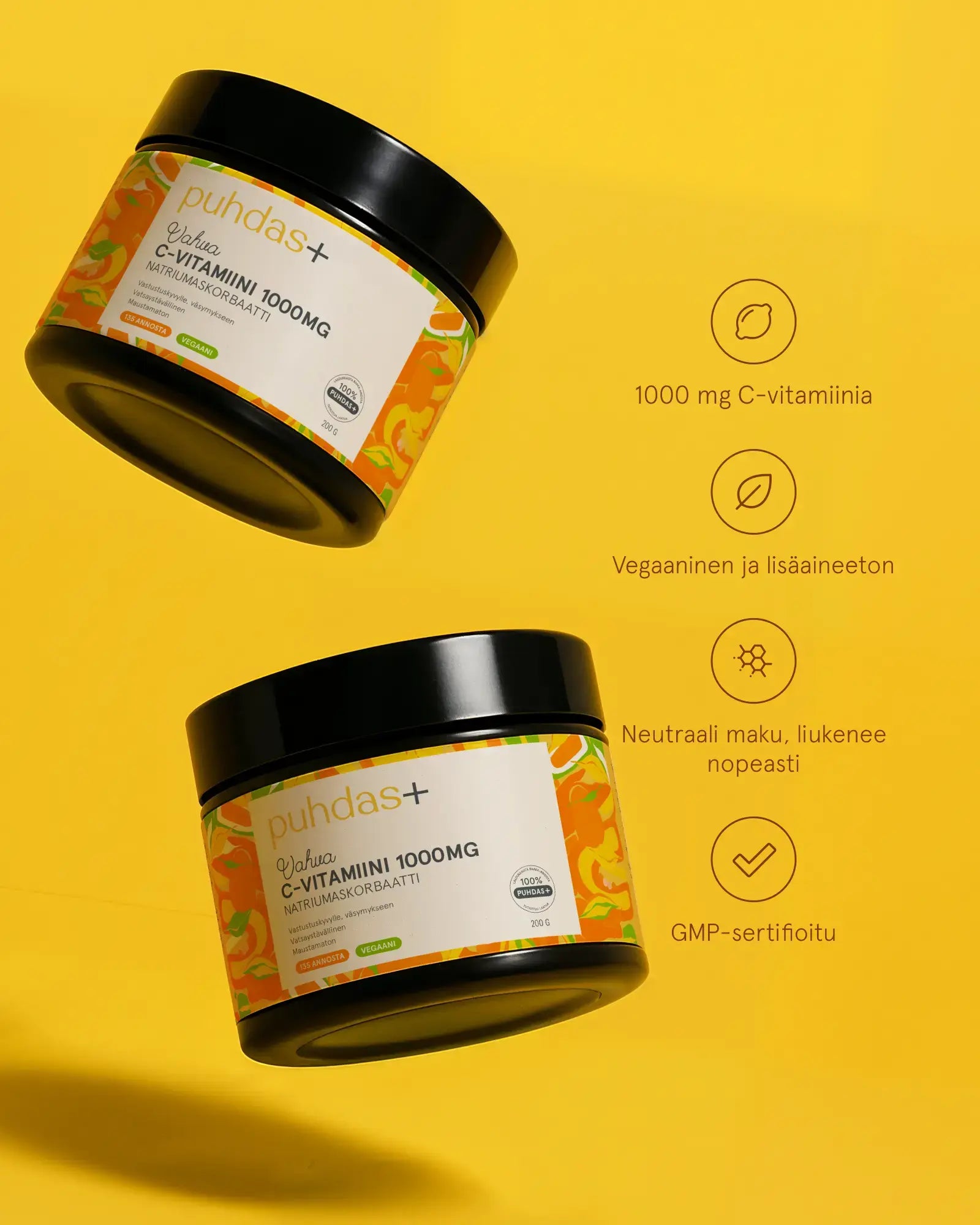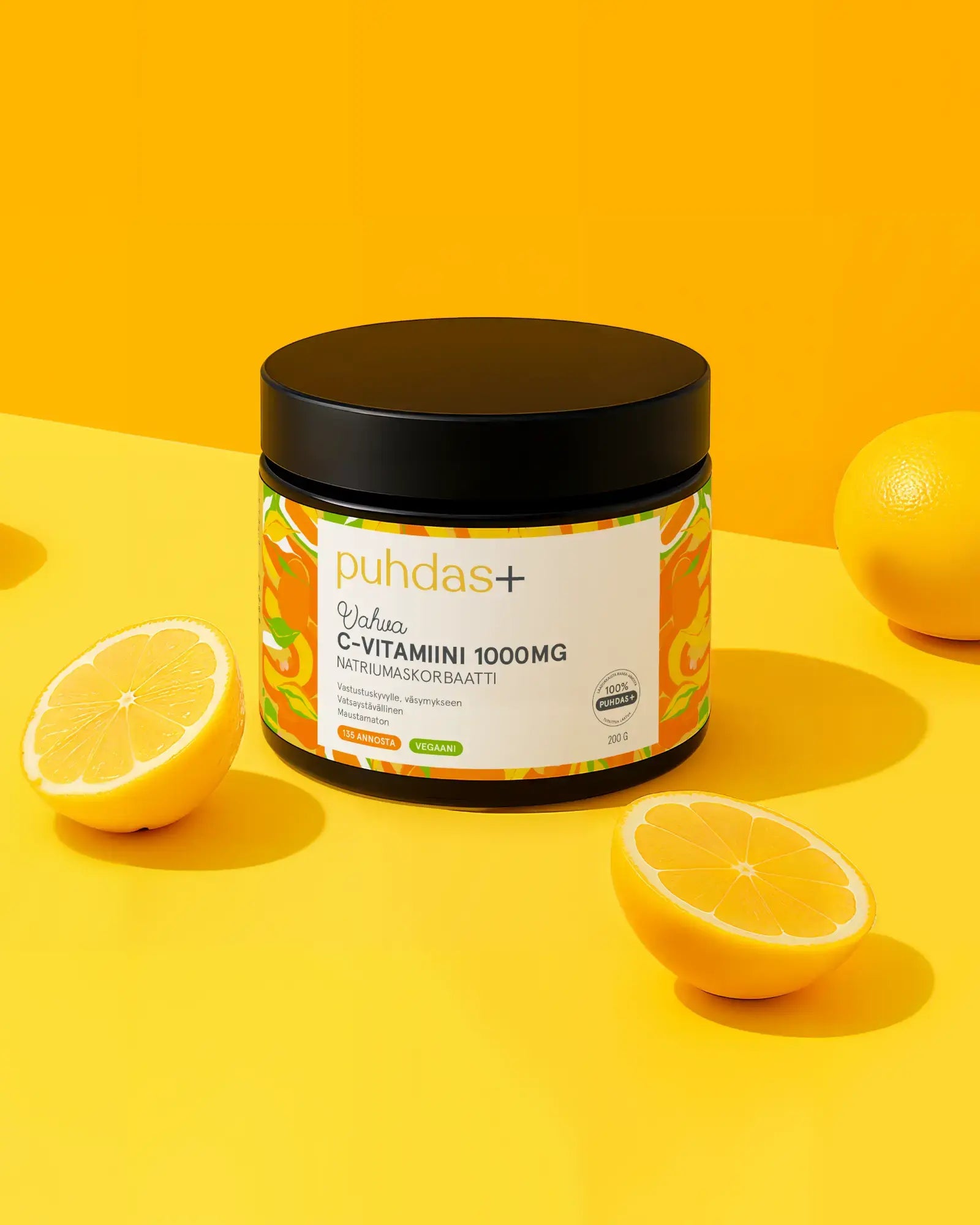 Lisäaineeton ja vatsaystävällinen C-vitamiini! Puhdas+ Vahva C-vitamiini sisältää vain C-vitamiinia, ei mitään muuta. Jauheena oleva natriumaskorbaatti imeytyy erinomaisesti ja sopii myös herkkävatsaisille. C-vitamiini auttaa vähentämään väsymystä ja uupumusta. C-vitamiini edistää immuunijärjestelmän normaalia toimintaa, myös raskaan liikunnan aikana ja sen jälkeen. C-vitamiini edistää hermoston normaalia toimintaa ja normaaleja psykologisia toimintoja. Pakkaus sisältää n. 180 annosta.