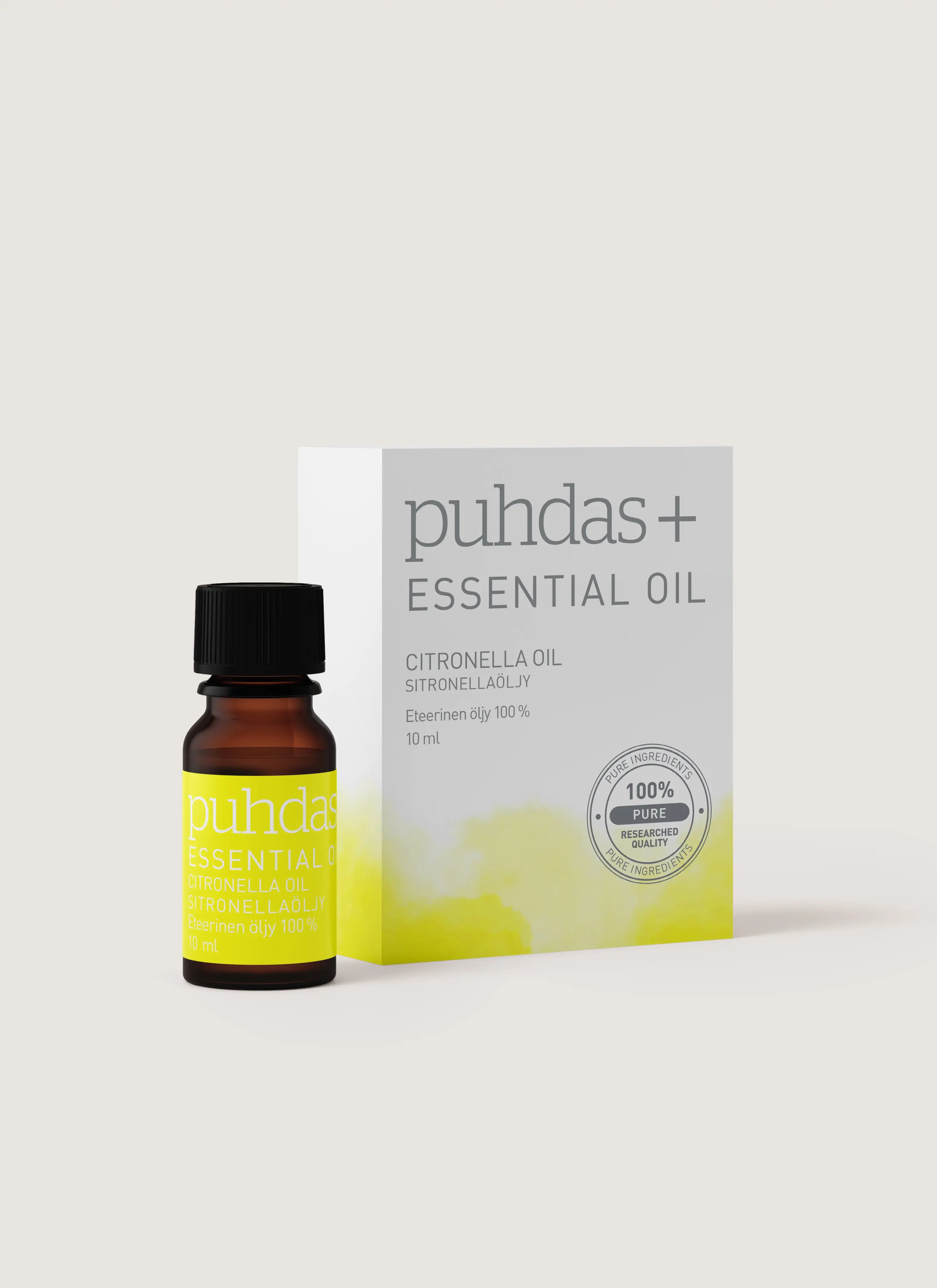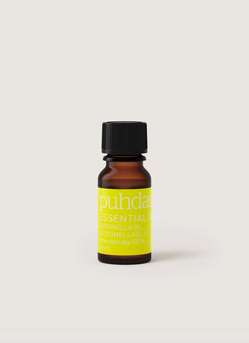 Puhdas+ Citronella essential oil has a fresh and strong lemon scent. The lemon-scented oil calms the mind and lifts the mood. Citronella is also used to alleviate the effects of headaches and migraines.