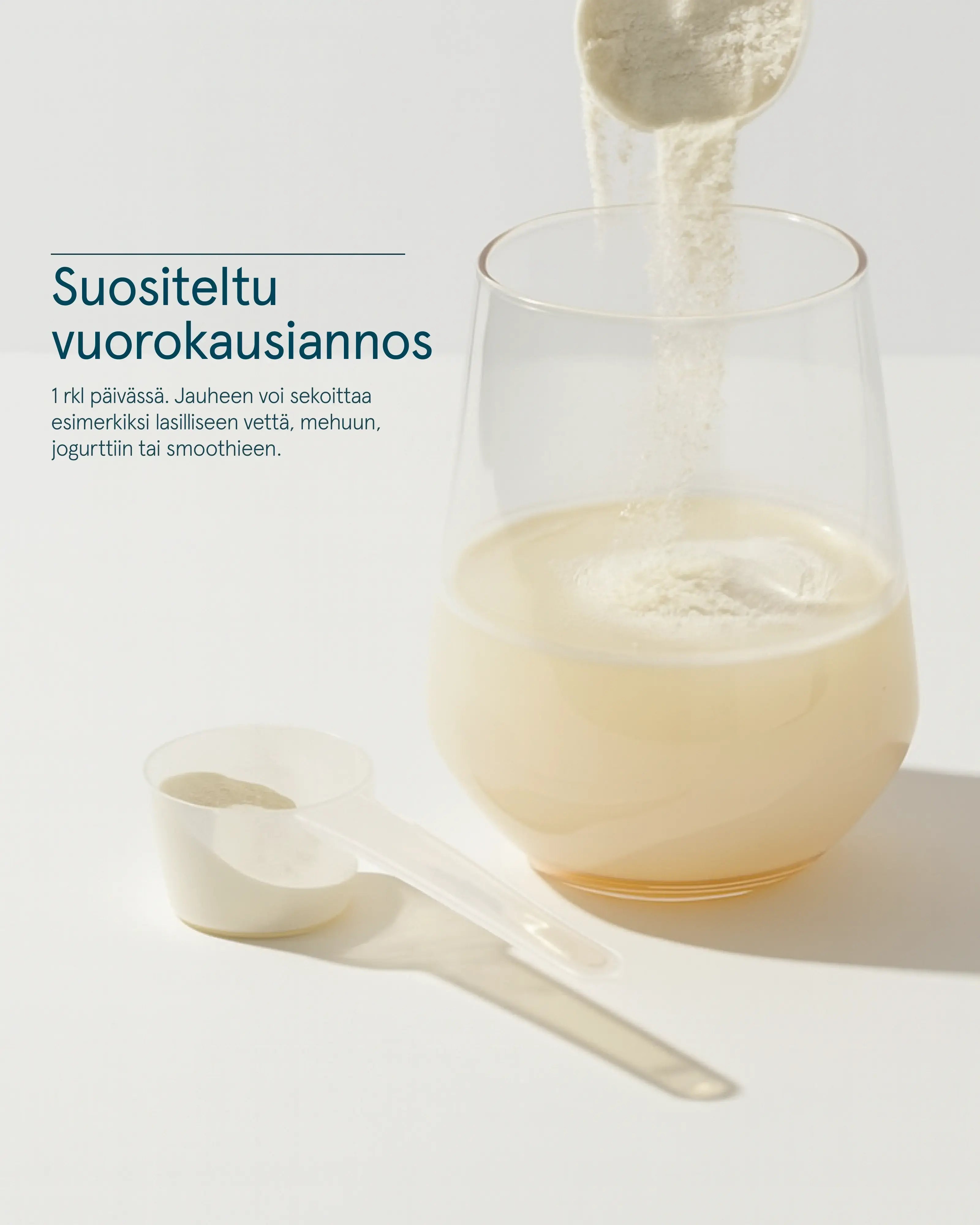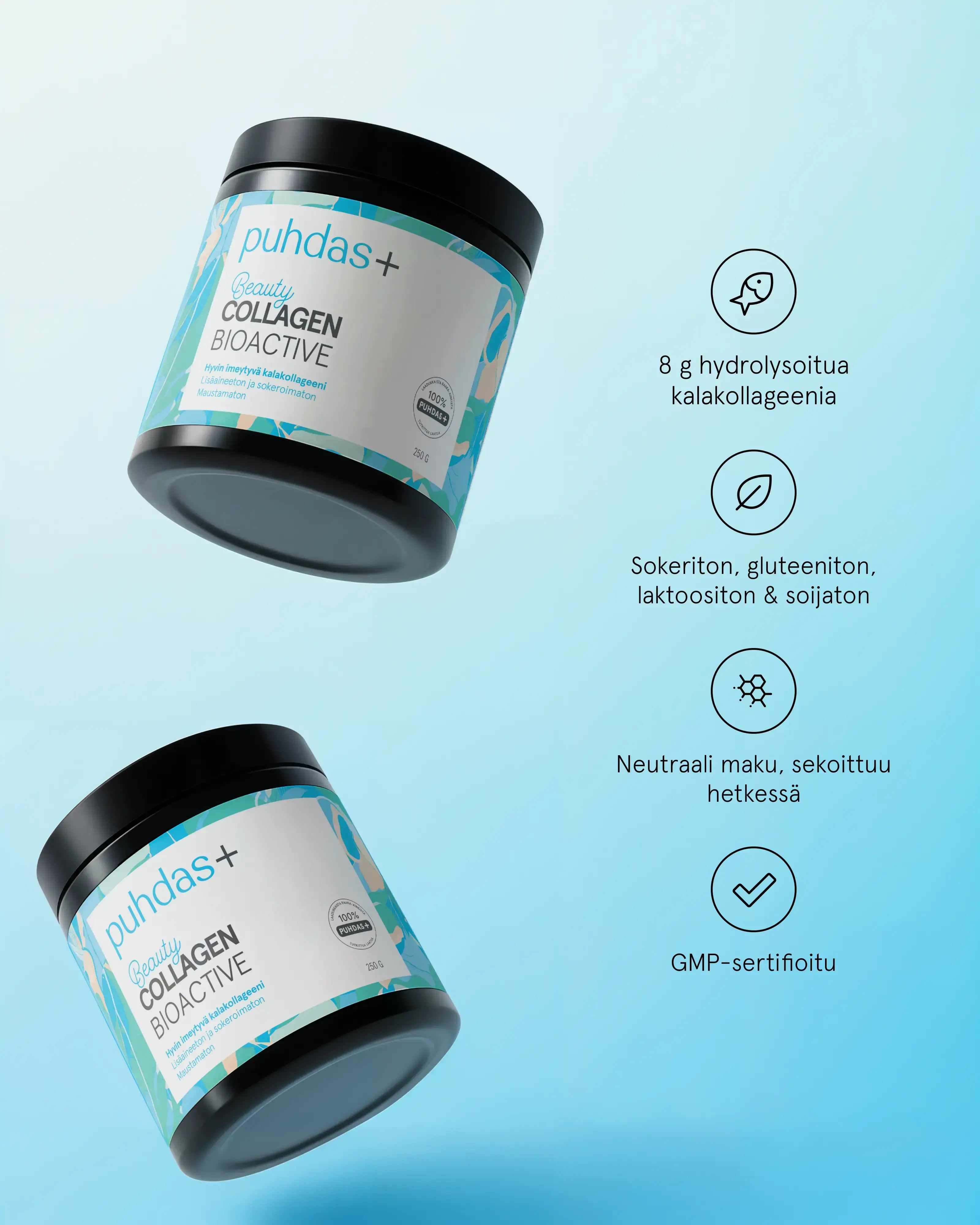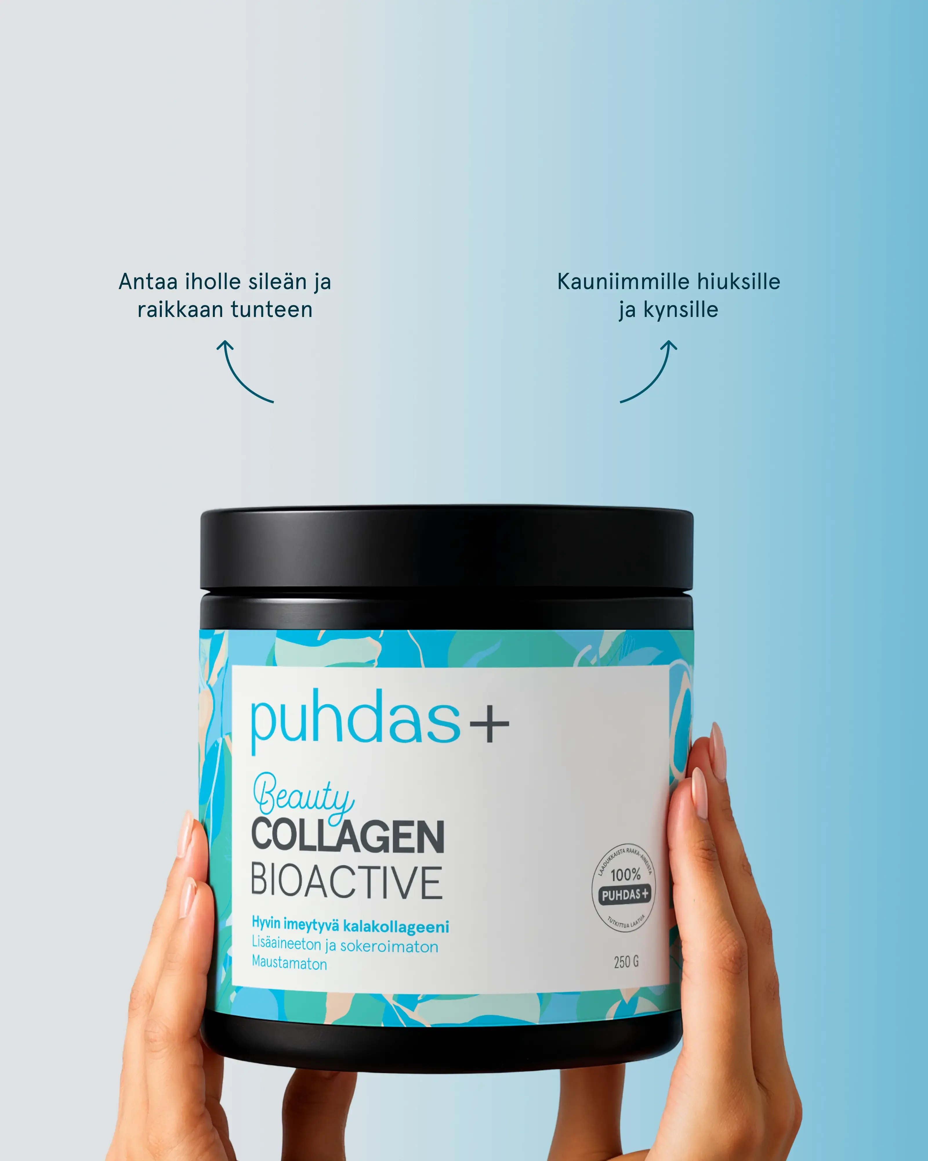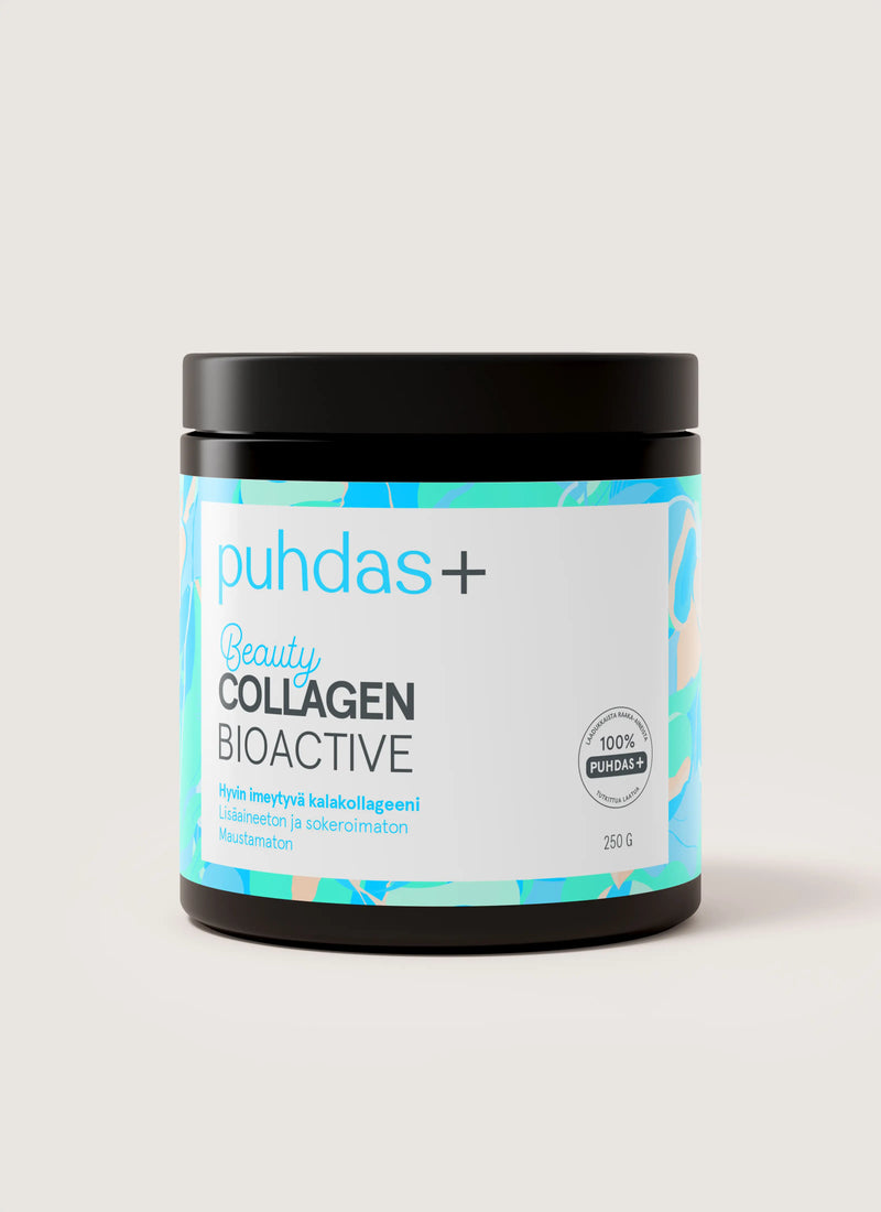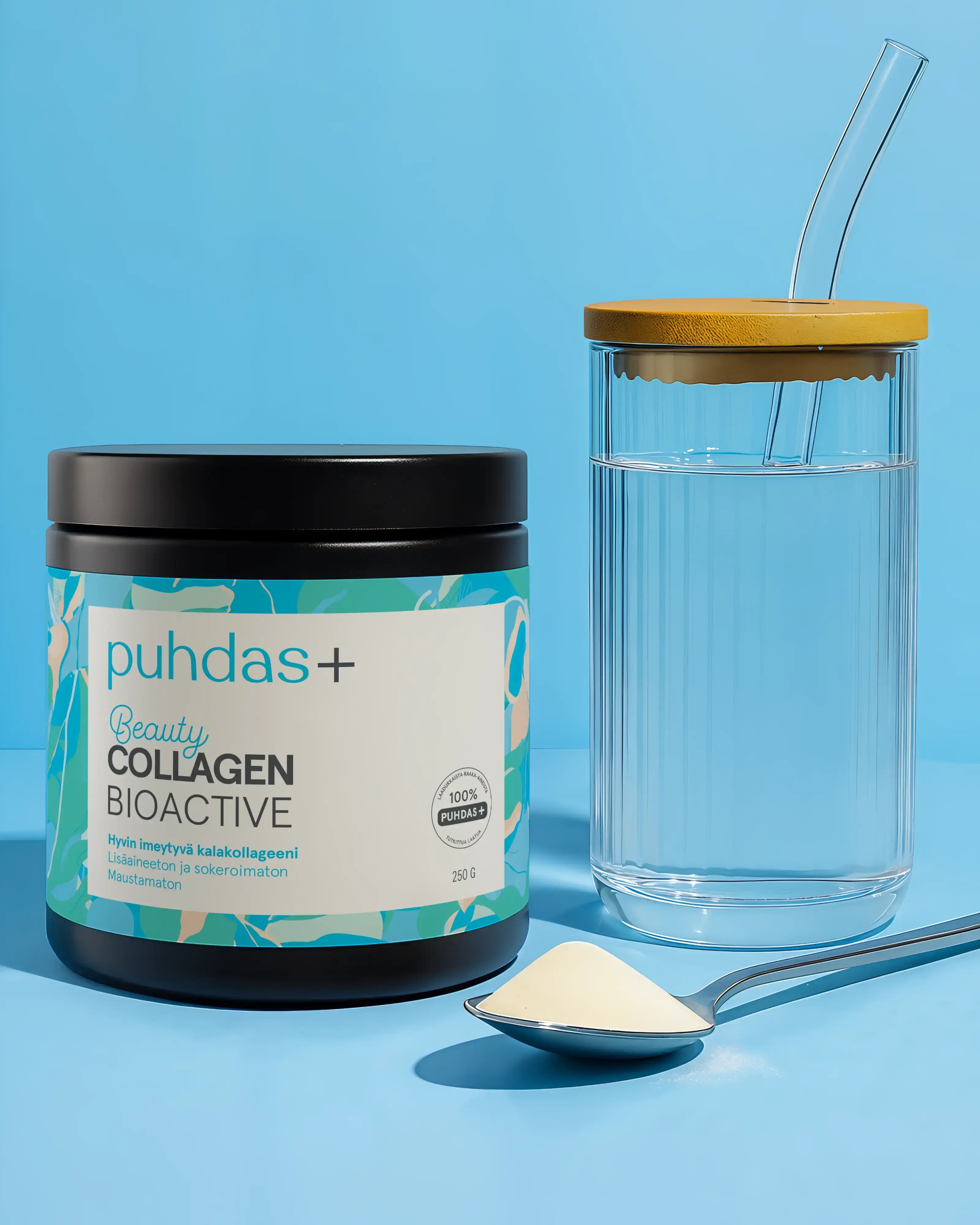 Puhdas+ Collagen Bioactive Natural contains only hydrolyzed fish collagen, nothing else. The additive- and flavor-free powder mixes easily with liquid or smoothies, and has a neutral taste. Fish collagen is a protein isolated from fish. Collagen makes up 30% of the protein in the human body and is found especially in the skin. Around the age of 25, the body begins to lose its ability to produce new collagen.