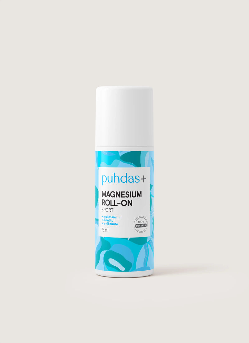 Puhdas+ Magnesium Sport roll-on is a strong magnesium product for joints and muscles for external use. In addition to magnesium, the product contains herbal glucosamine, menthol and effective arnica extract.