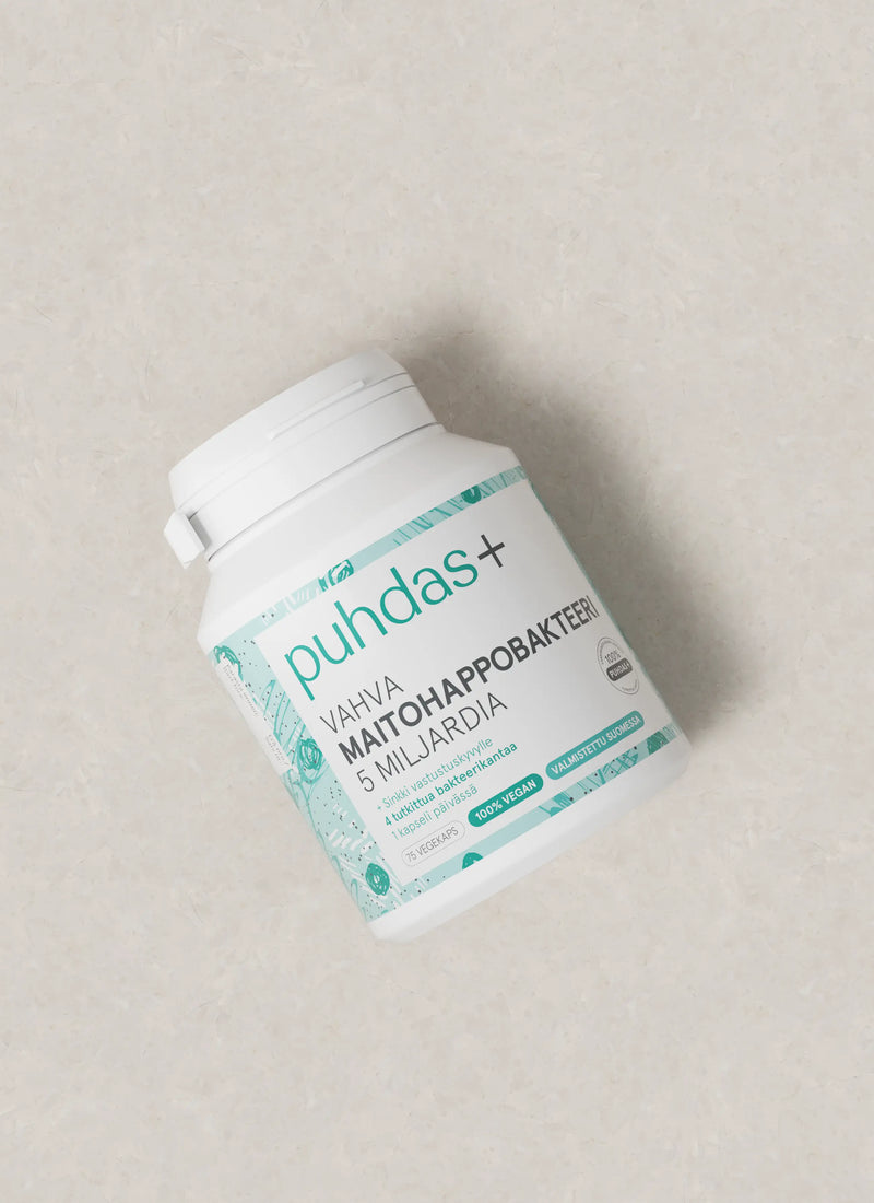 Versatile and effective! Puhdas+ Lactic acid bacteria 5 billion contains an effective combination of 4 different strains of lactic acid bacteria and zinc, which promotes the normal functioning of the immune system. One Puhdas+ lactic acid bacteria capsule contains billions of live Lactobacillus rhamnosus, Bifidobacterium lactis, Lactobacillus reuteri and Lactobacillus casei bacteria. Does not contain milk, lactose or gluten. Made in Finland.