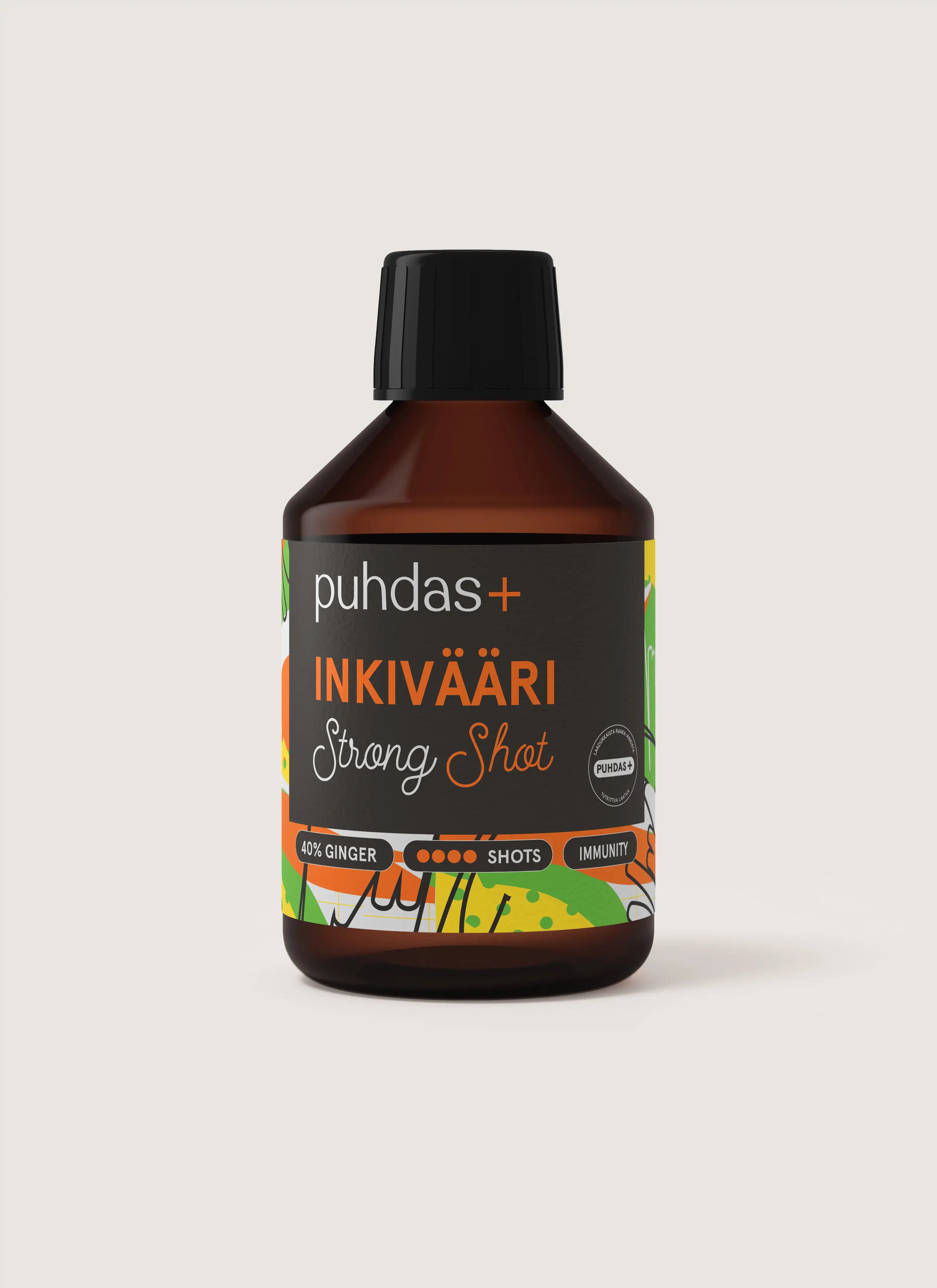 Stimulation, resistance and strength for the day! Puhdas+ Strong ginger shot is made from cold-pressed ginger (40%), apple and lemon. The product is manufactured in Finland.