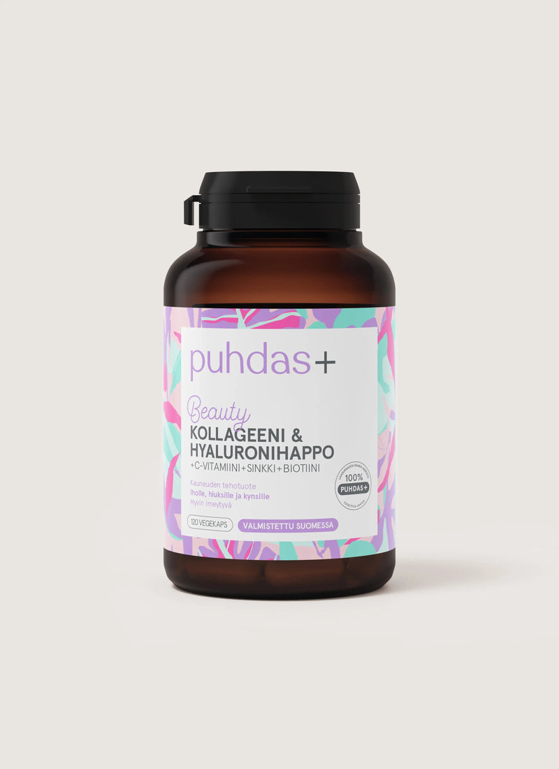 A powerful beauty product for skin, hair and nails! Puhdas+ Collagen & Hyaluronic Acid is designed to support beauty holistically. The product contains an effective combination of hydrolyzed fish collagen, hyaluronic acid, vitamin C, biotin and zinc. Vitamin C promotes normal collagen formation for normal skin function. Biotin contributes to maintaining normal skin and hair. Zinc contributes to normal skin and nails. Made in Finland.