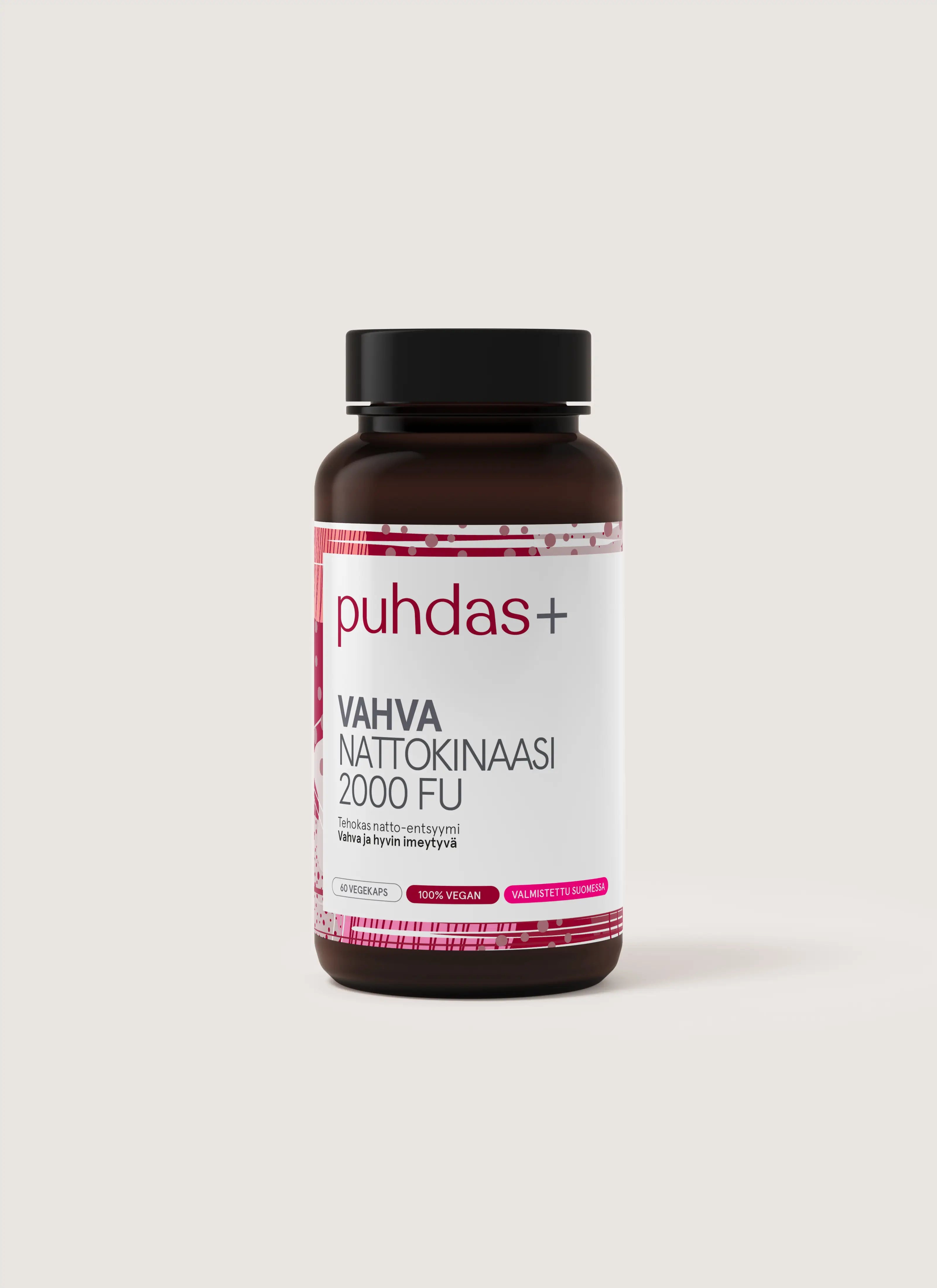 Puhdas+ Nattokinase contains an effective natto enzyme obtained from the traditional Japanese natto food. The product is strong and well absorbed. The capsule is small and easy to swallow.