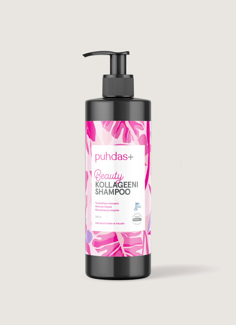 Puhdas+ Kollageeni Shampoo sisältää hiuksille elintärkeää kollageenia, joka tuuheuttaa ja antavaa hiuksille uutta elinvoimaa ja elävyyttä. Tuotteen valmistaa kotimainen Ecocert- sertifioitu kosmetiikkatehdas. Pakkauskoko 240 ml.