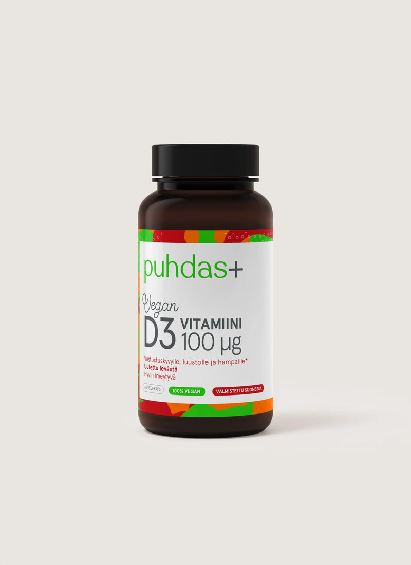 Hyvin imeytyvä kasviperäinen D3-vitamiini! Puhdas+ D3-vitamiinivalmiste sisältää kasviperäistä D3-vitamiinia, joka on uutettu levästä. Levästä uutettu korkealaatuinen D3-vitamiini on tuotteessa luonnollisessa bioaktiivisessa muodossa. D-vitamiini edistää immuunijärjestelmän normaalia toimintaa sekä luuston ja hampaiden pysymistä normaaleina. Valmistettu Suomessa.