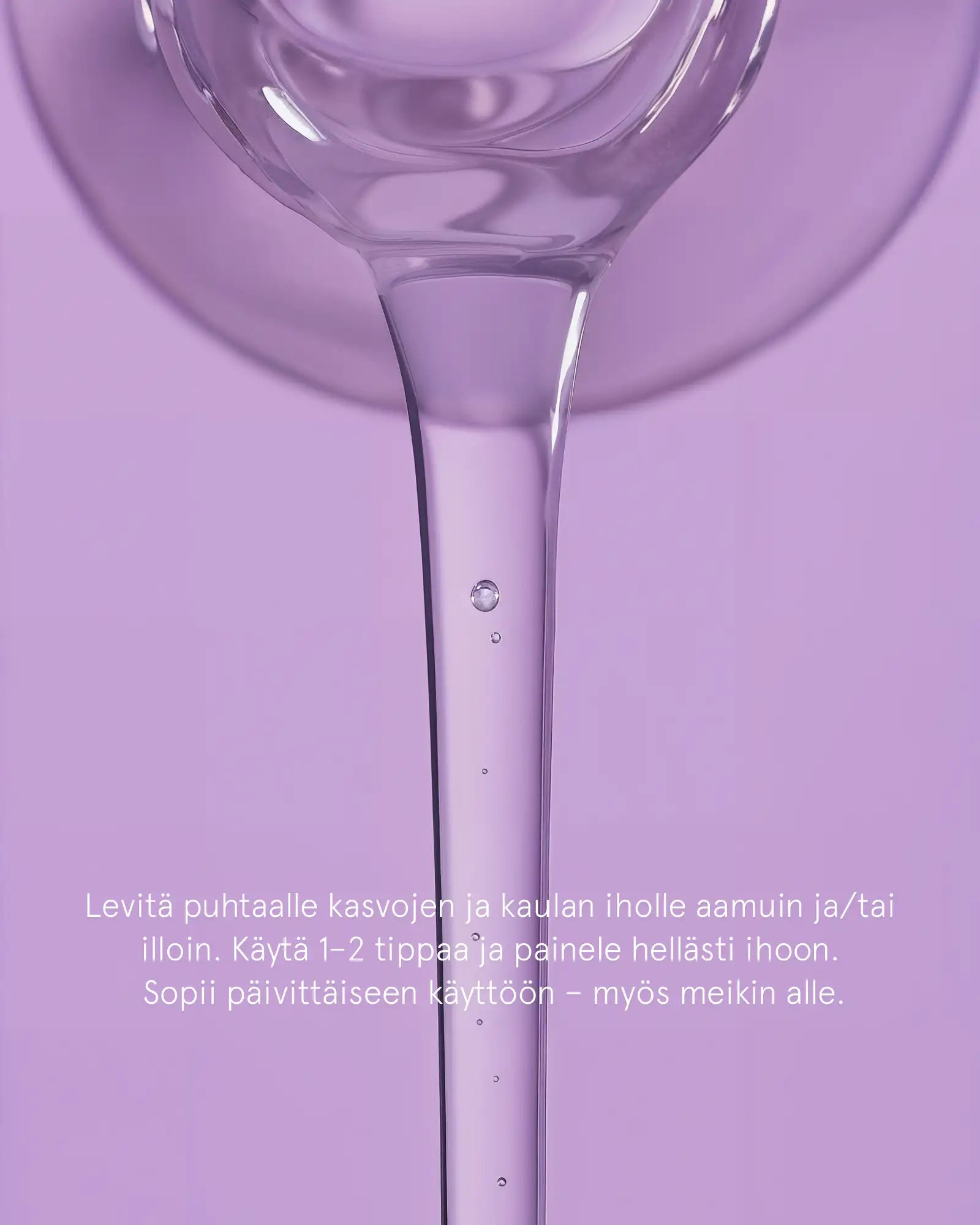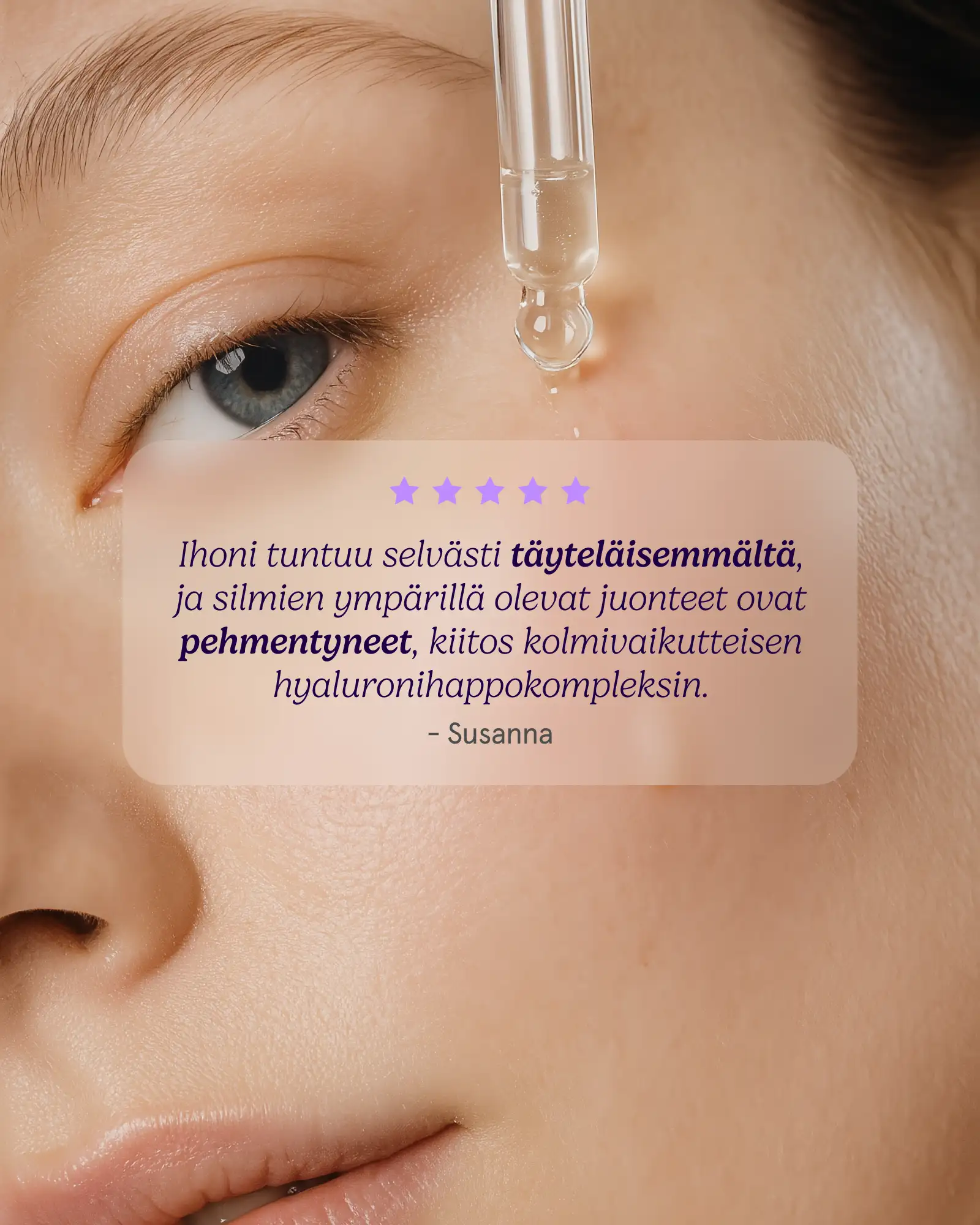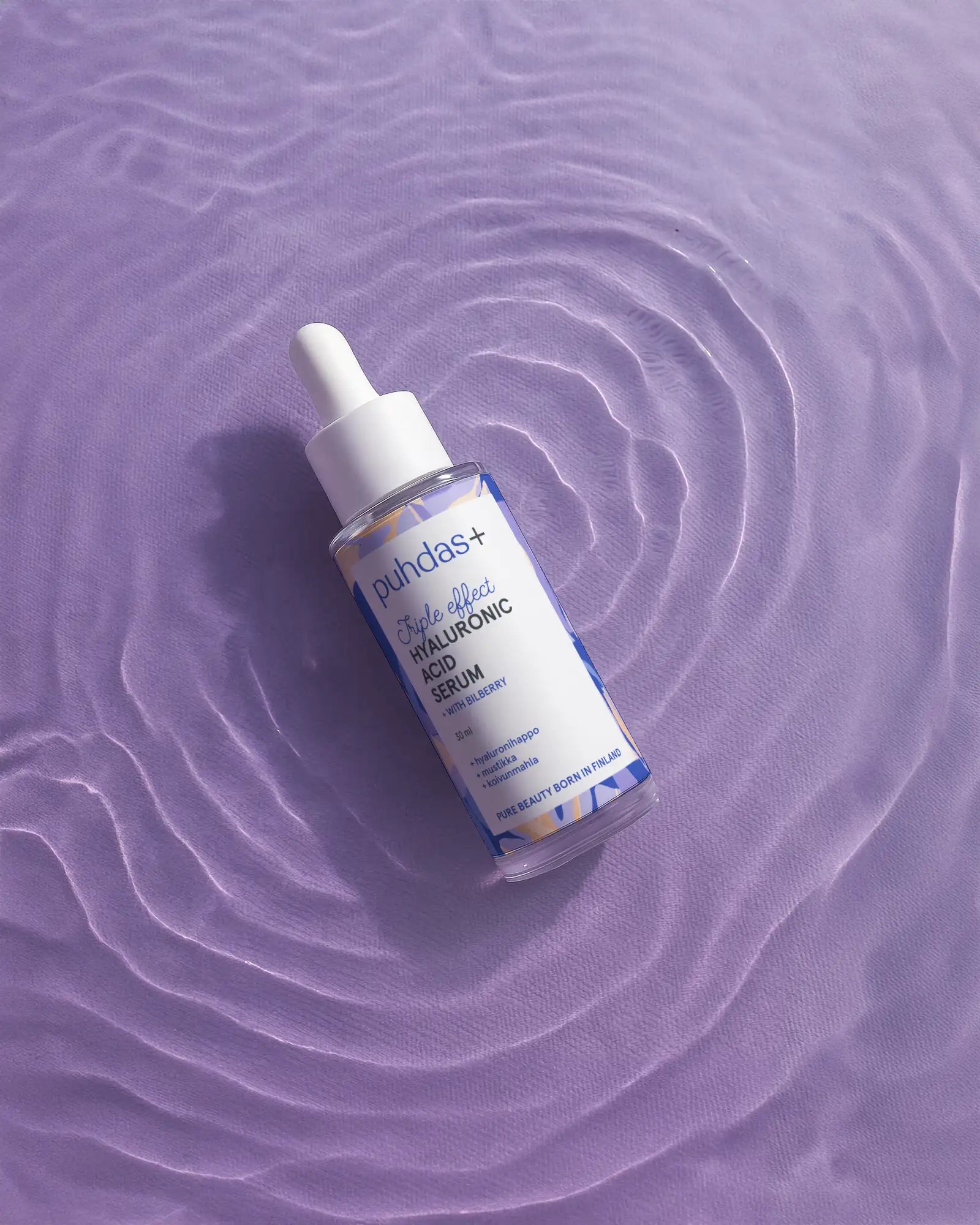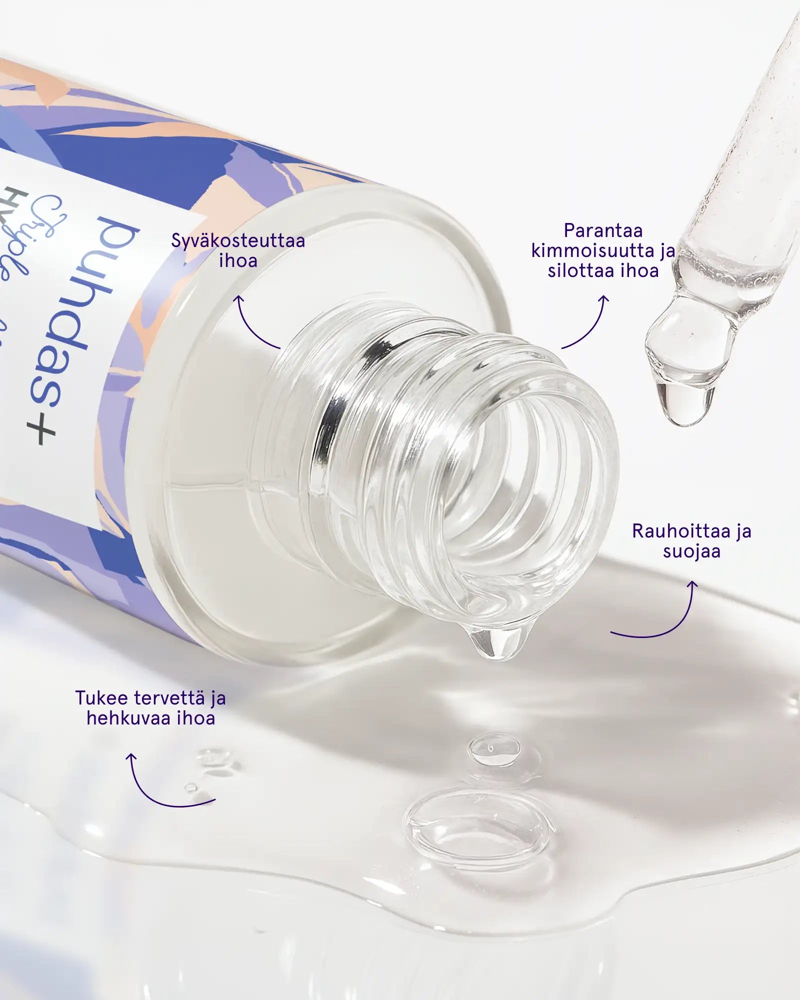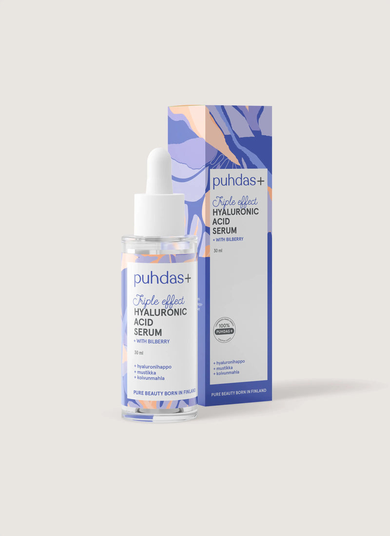 Kotimainen Puhdas+ Hyaluronihapposeerumi häivyttää välittömästi ihon pintakerroksen juonteita ja kosteuttaa tehokkaasti, pitäen ihon hehkuvana koko päivän. Puhdas+ Hyaluronihapposeerumi on kolmivaikutteinen eli siinä on käytetty kolmea eri hyaluronihappomolekyyliä. Hyaluronihappo on ihon pintakerroksen tehokosteuttaja ja se imeytyy myös ihon syvempiin kerroksiin pitäen ihon terveenä ja nuorekkaana. Seerumin toisena tehoaineena on Mustikka, joka vahvana antioksidanttina suojaa ihoa ulkoisia ärsykkeitä ja saasteita vastaan. Valmistettu Suomessa.