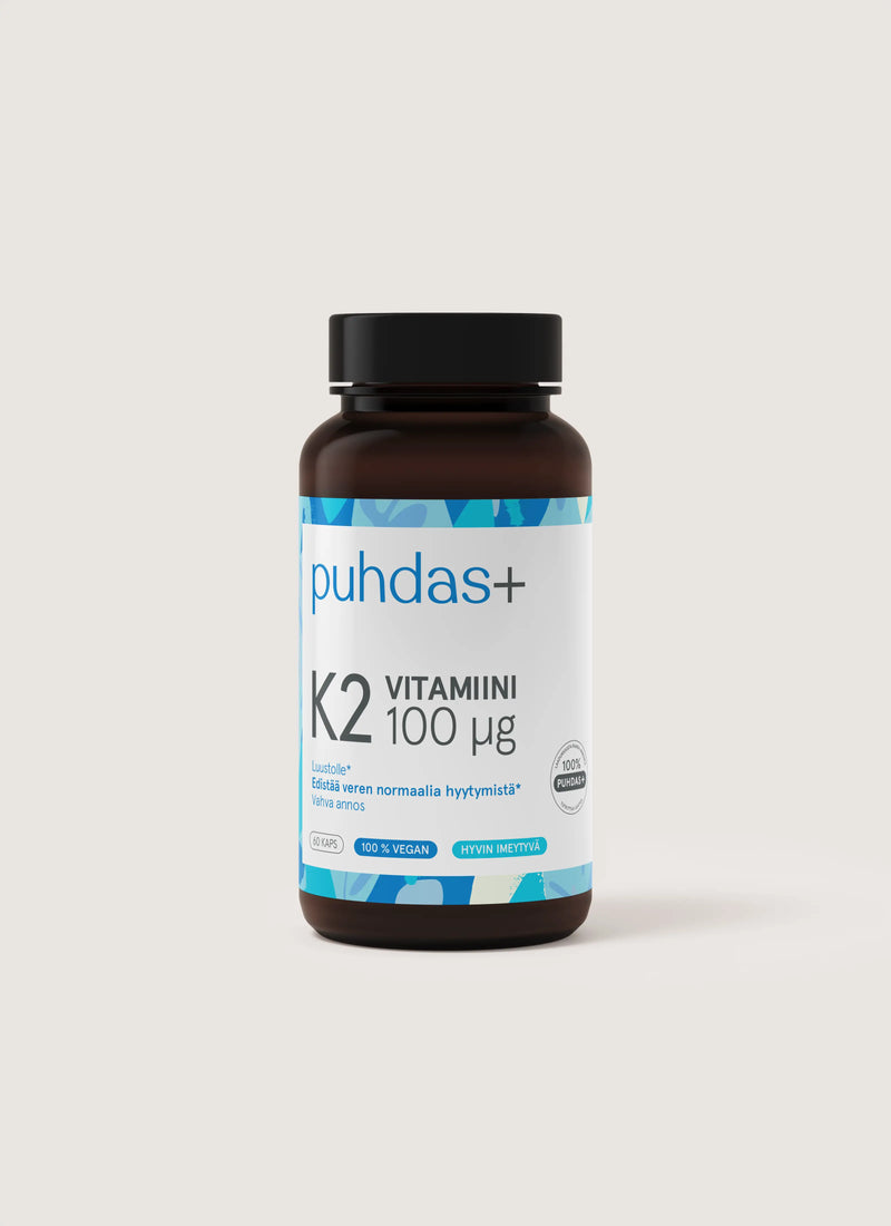 Puhdas+ K2-vitamiini on vahva K-vitamiinivalmiste. Tuotteen sisältämä MenaQ7-menakinoni on tutkittu K-vitamiini, jonka elimistö käyttää poikkeuksellisen tehokkaasti hyödykseen. K-vitamiini edistää sekä luiden pysymistä normaaleina että veren normaalia hyytymistä. 100% vegaaninen. Valmistettu Suomessa.