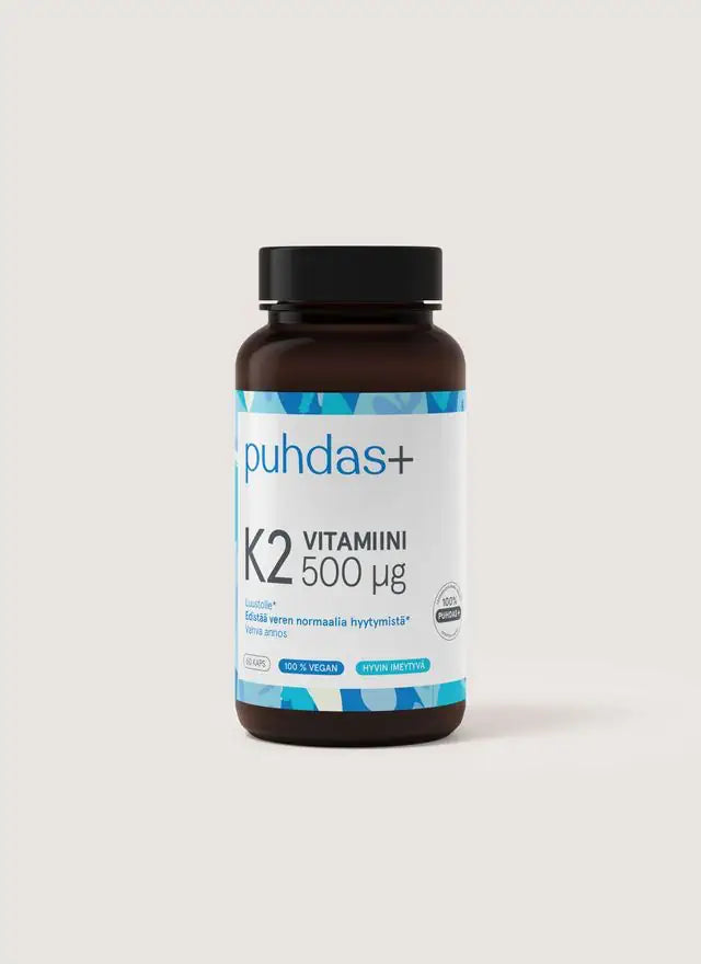 Puhdas+ Vahva K2-vitamiini sisältää vahvan annoksen hyvin imeytyvää K2-vitamiinia.