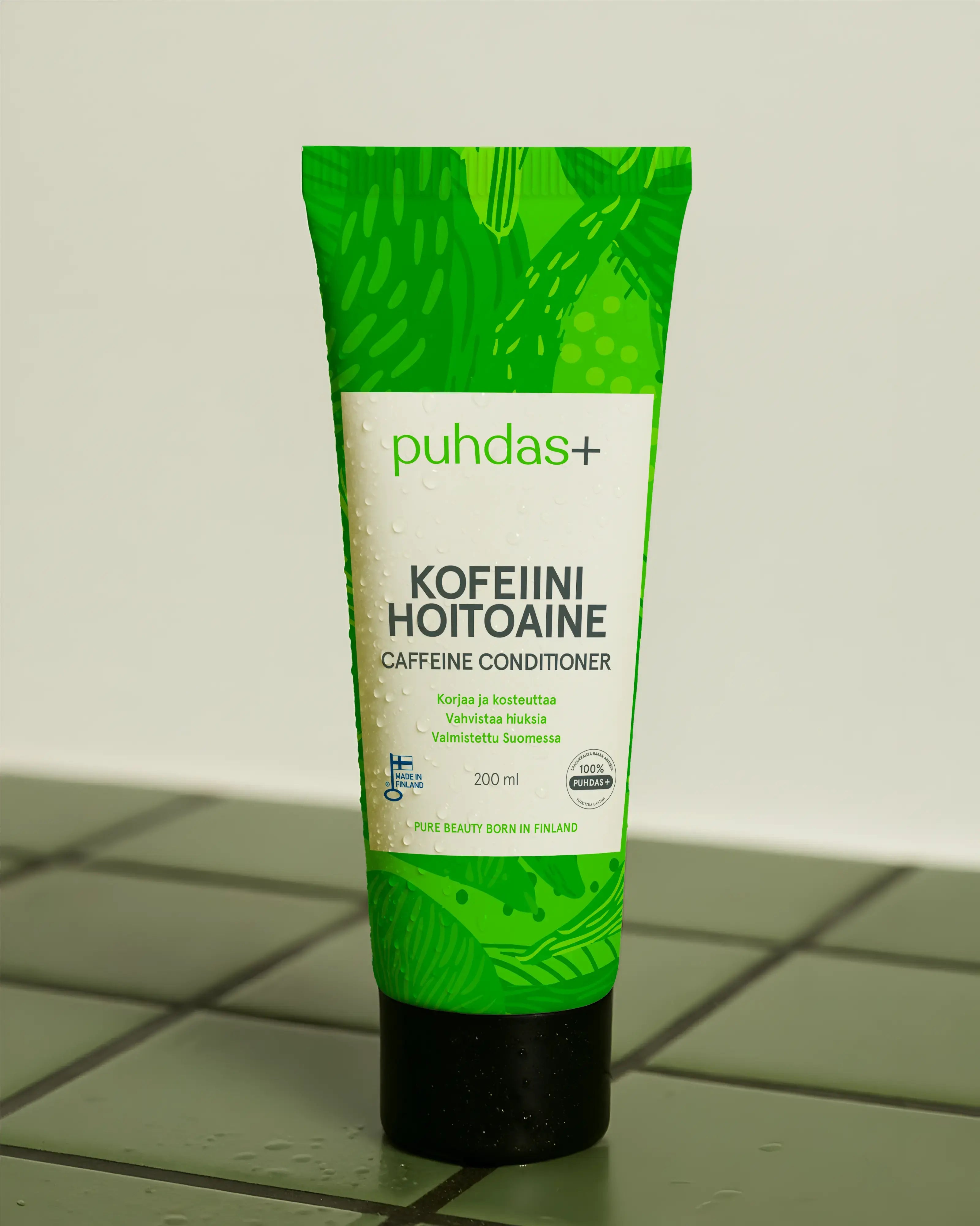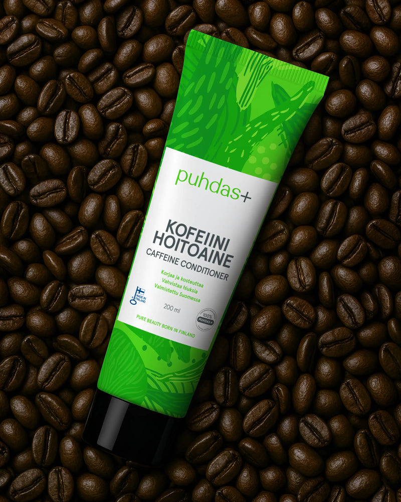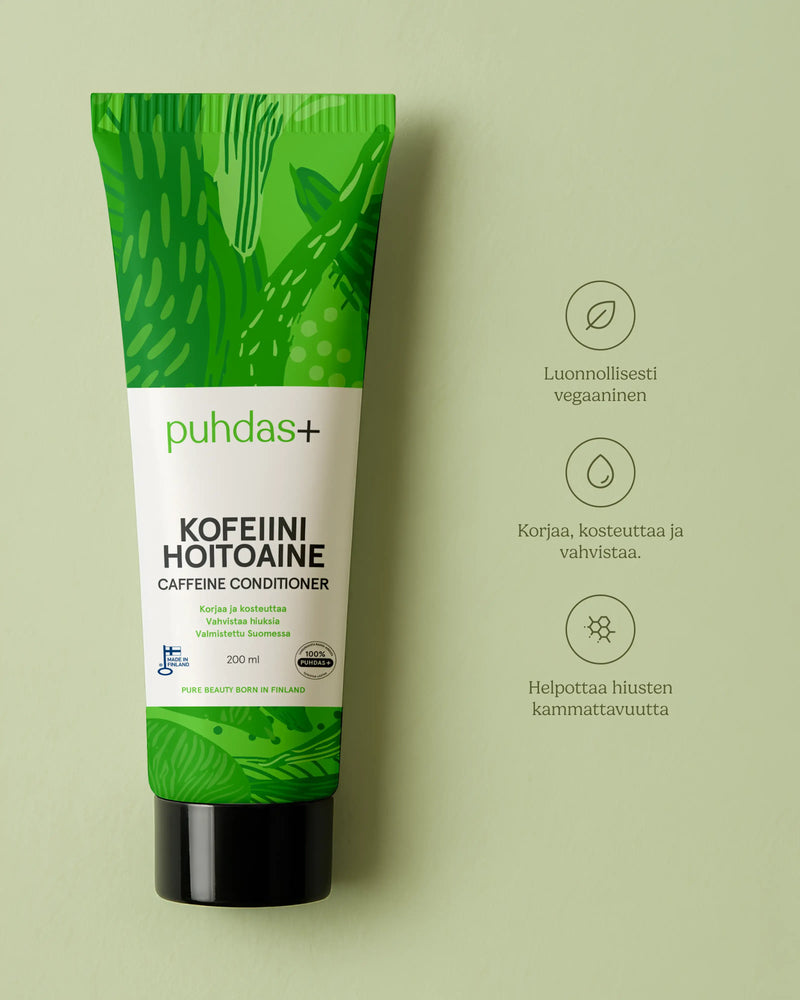 Puhdas+ Kofeiini hoitoaine on suunniteltu korjaamaan, kosteuttamaan ja vahvistamaan hiuksia. Hoitoaine estää hiustenlähtöä sekä hiusten ohenemista. Kosteuttavat raaka-aineet ravitsevat hiuksia sekä tekevät hiuksista helposti kammattavat.