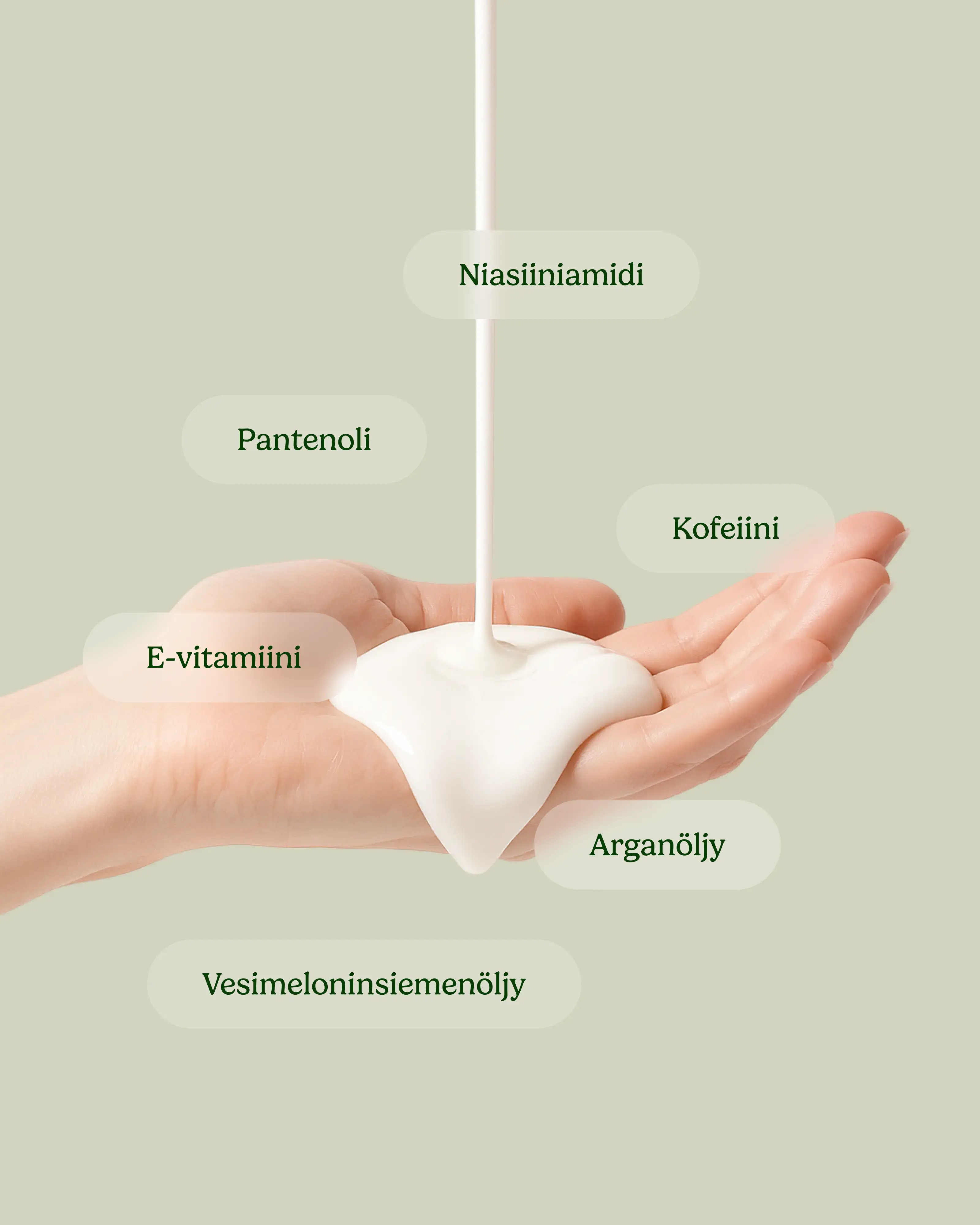 + Kofeiini – Aktivoi hiuspohjaa ja tukee hiusten luonnollista kasvua.