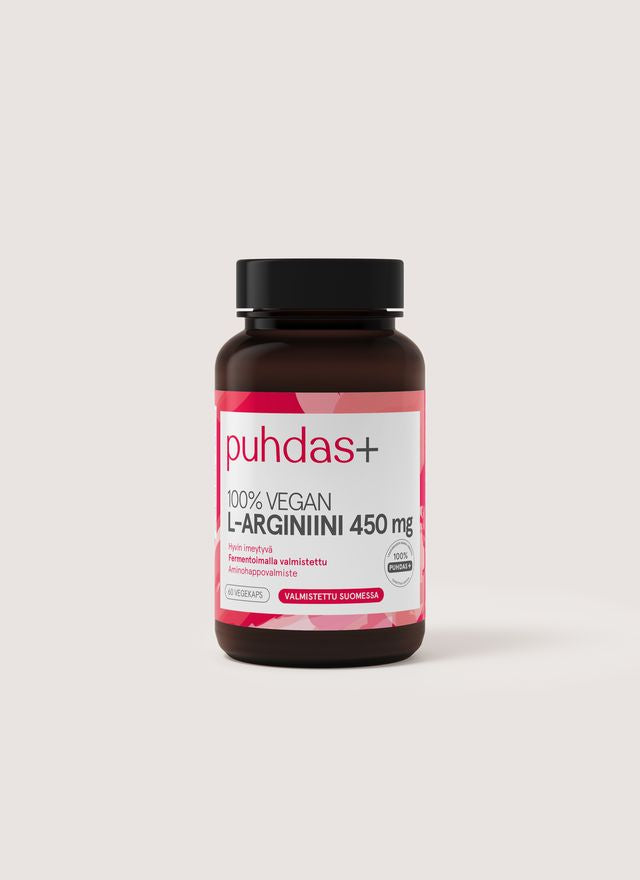 100% vegaaninen L-Arginiini tehokkaassa ja hyvin imeytyvässä vapaassa muodossa! Arginiini on kehossamme esiintyvä tärkeä aminohappo. Puhdas+ Arginiinikapselien sisältämä L-Arginiini on valmistettu fermentoimalla, eikä prosessissa ole käytetty eläinperäisiä ainesosia. Tuote on kehitetty ja valmistettu Suomessa.