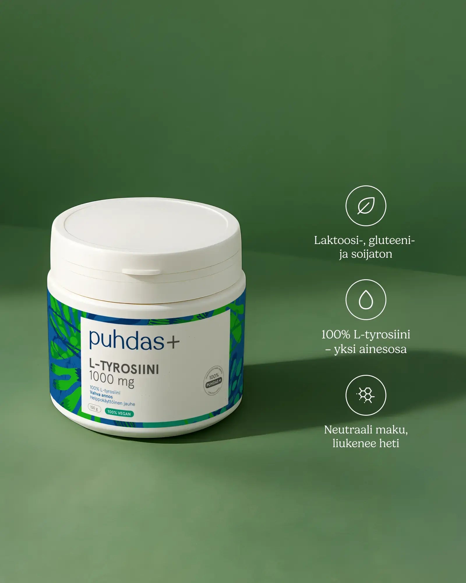Sisältää hyvin imeytyvässä muodossa olevaa 100% L-tyrosiinia. Tyrosiini on luontainen aminohappo.
