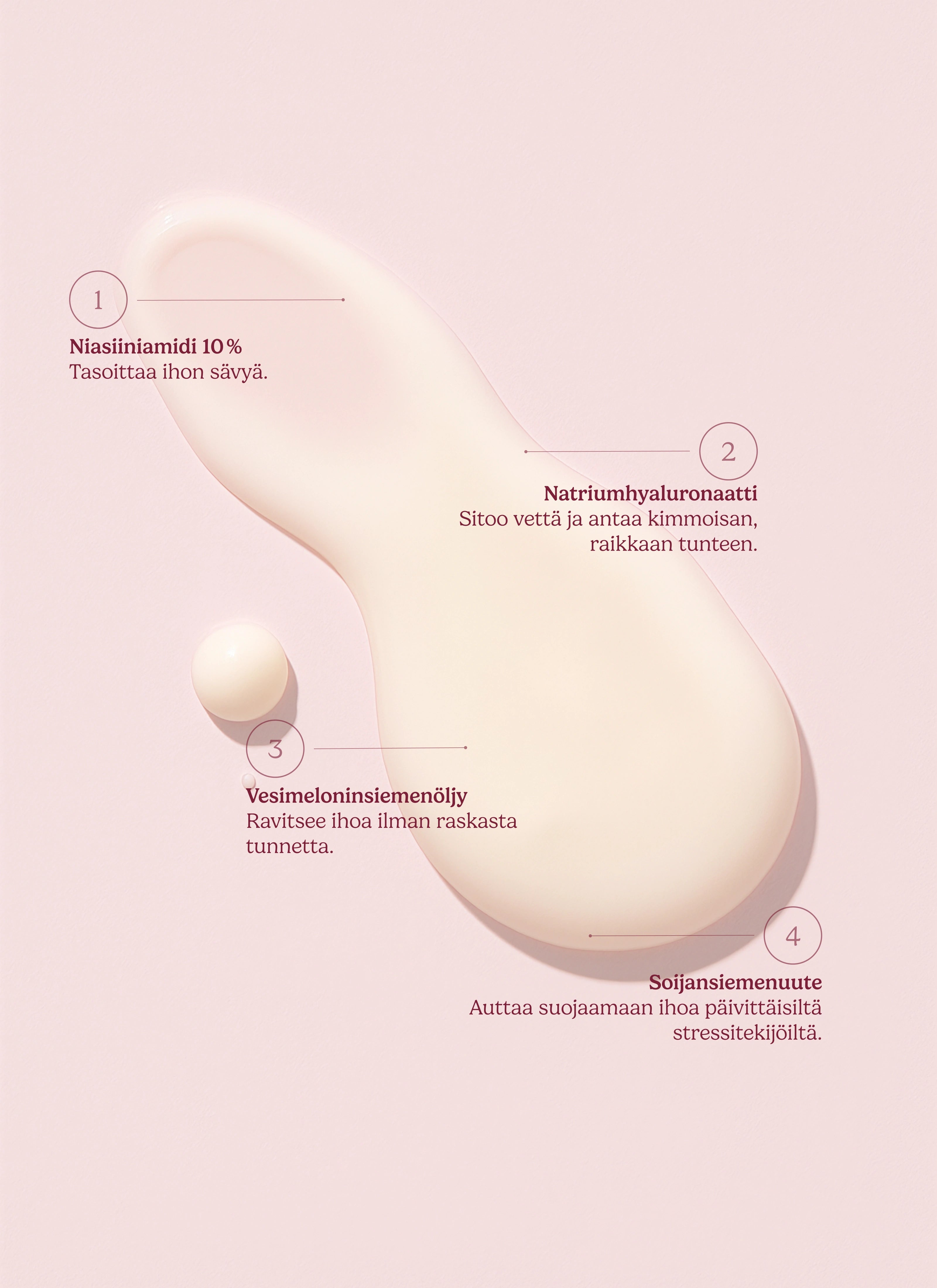 - Ikääntyvälle iholle: Korkeampi pitoisuus auttaa vähentämään hienoja juonteita ja ryppyjä sekä parantamaan ihon kimmoisuutta.