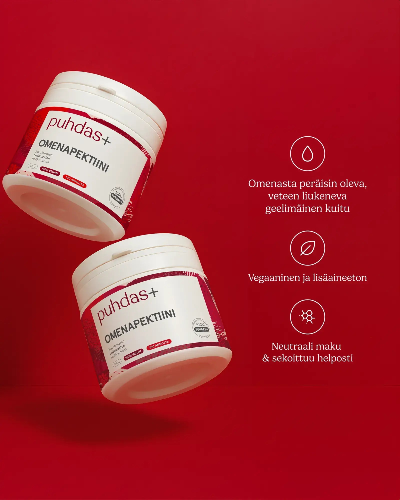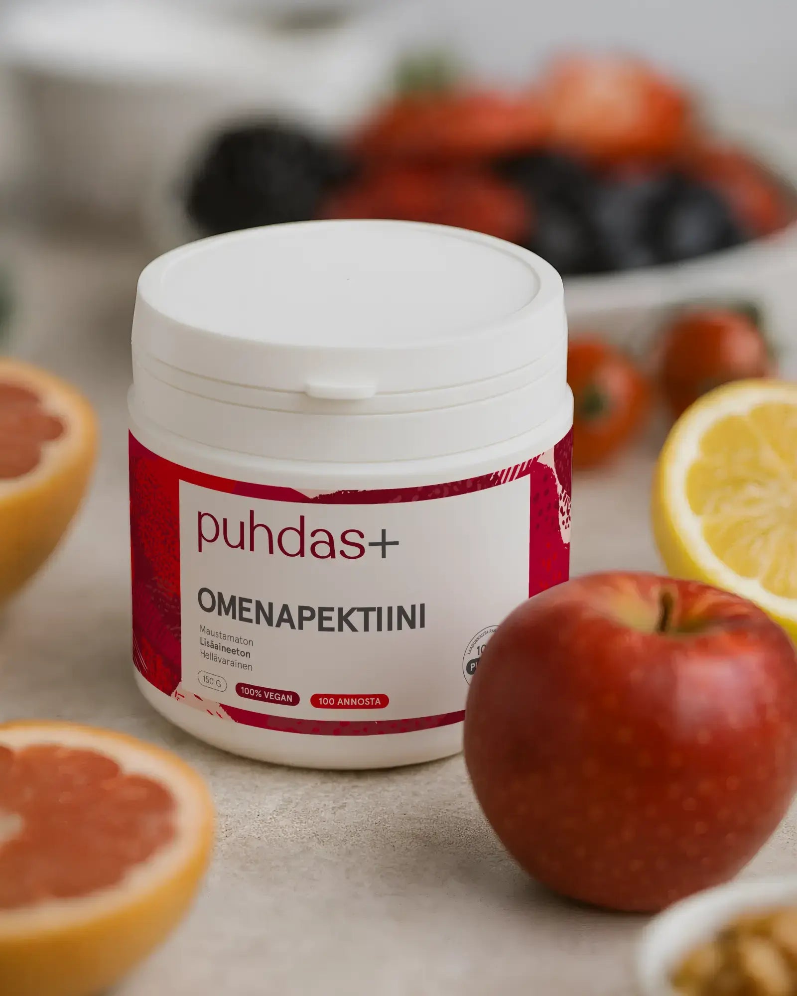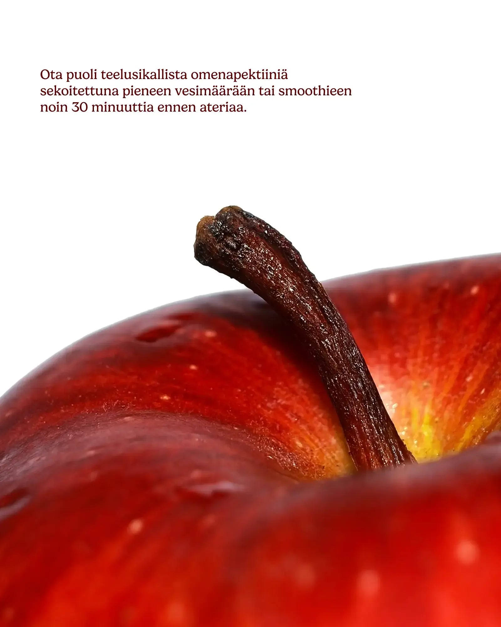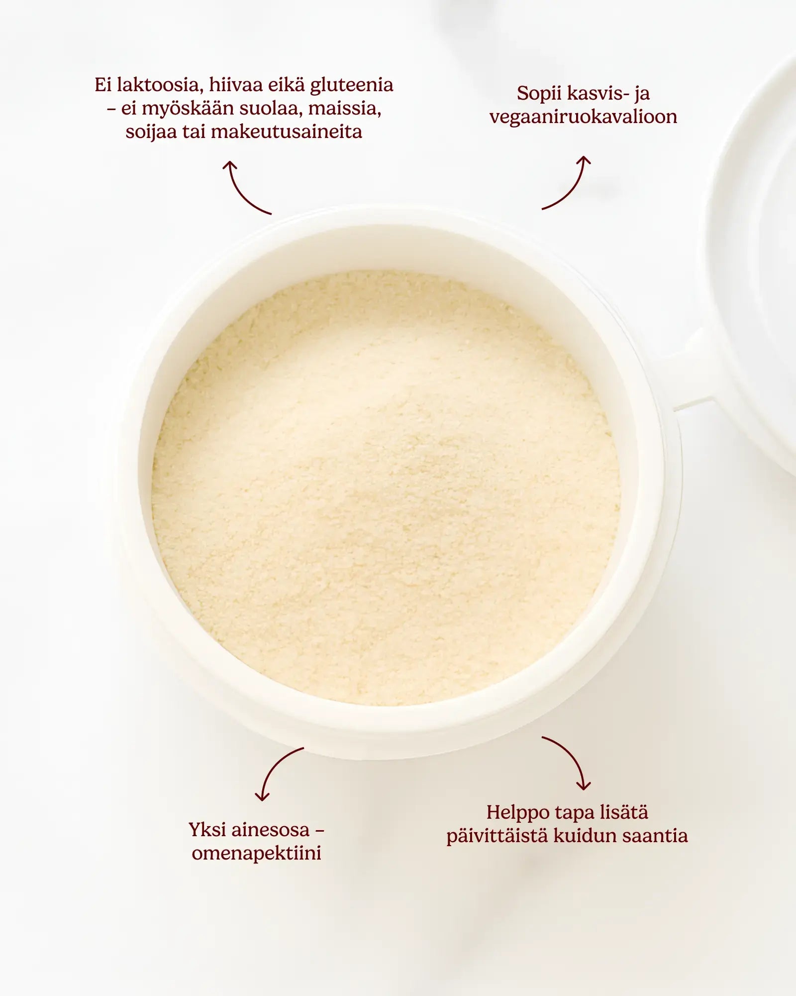 Riittoisa, luonnollinen, omenasta peräisin oleva kuitu. Omenapektiini on vesiliukoinen, geeliytyvä kuitu, jonka avulla voidaan helposti lisätä päivittäistä kuidun saantia. Omenapektiiniä sekoitetaan pieni määrä veteen. Käyttö aloitetaan 1/2 teelusikallisesta. Omenapektiiniä voi käyttää turvallisesti useita kertoja päivässä. Tuotetta kannattaa käyttää noin 30 min ennen aterioita.