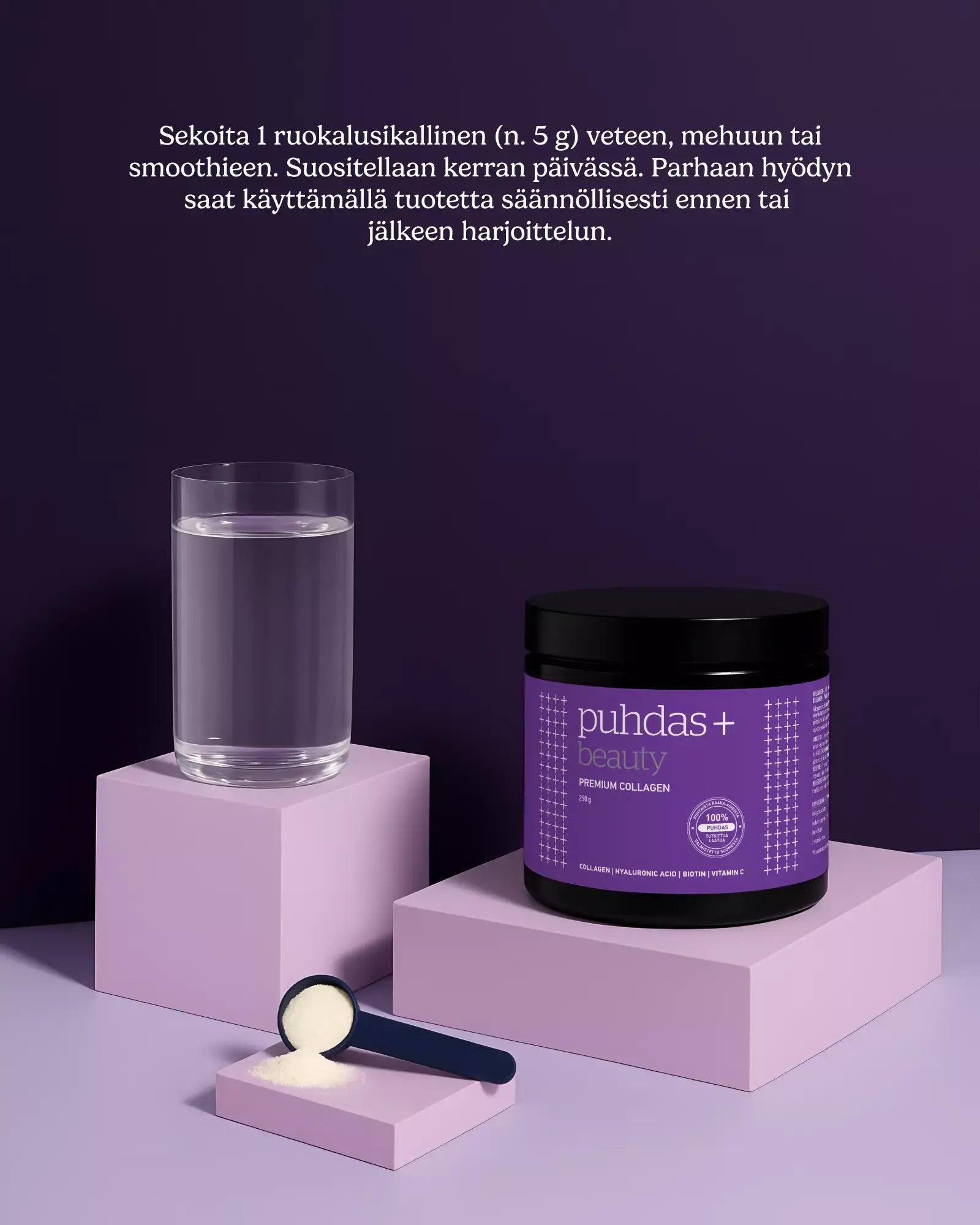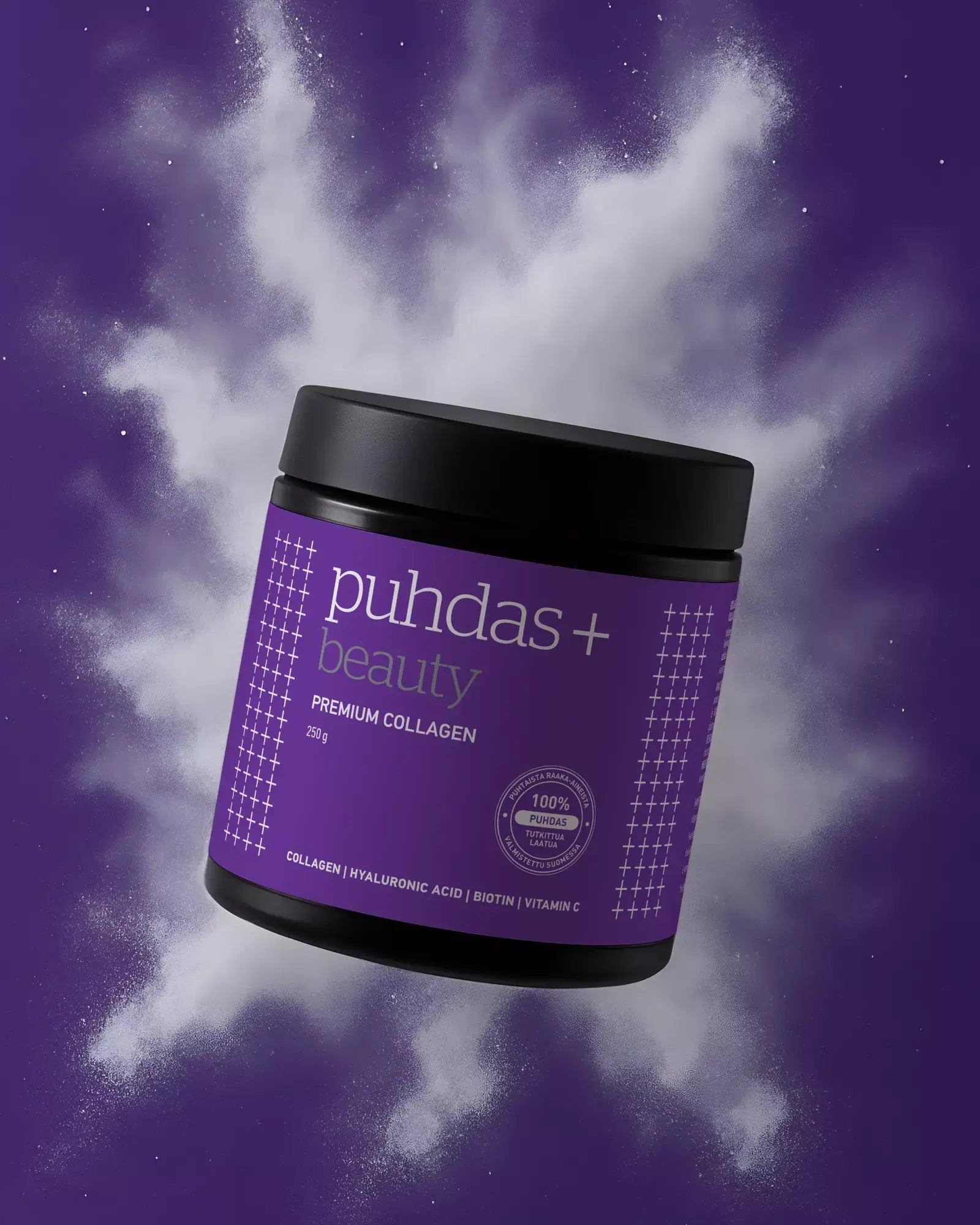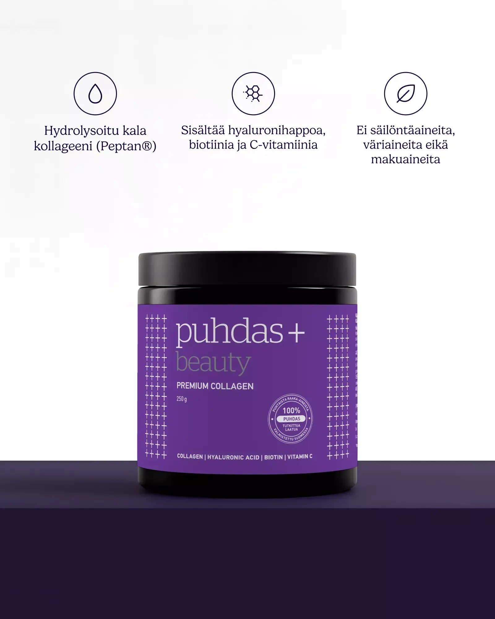 Puhdas+ kollageenituotteet sisältävät tutkittua, hydrolysoitua eli bioaktiivista 1. tyypin kollageenia.
