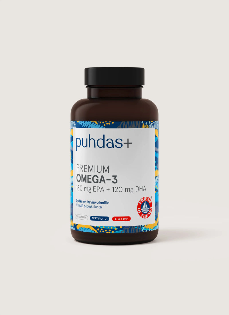 Sydämen hyvinvoinnille! Puhdas+ Premium Omega-3 on laadukas ja sertifioitu kalaöljy. Tuotteesta saat EPA- ja DHA-rasvahappoja samassa suhteessa kuin ne ovat luonnollisessa kalaöljyssä. Rasvahapot ovat luonnollisessa, hyvin imeytyvässä triglyseridi-muodossa. Puhdas+ Premium Omega-3 -valmisteen tuotannossa käytetään villiä pikkukalaa, joka on kalastettu Etelä-Tyynenmeren saastumattomilta vesiltä.