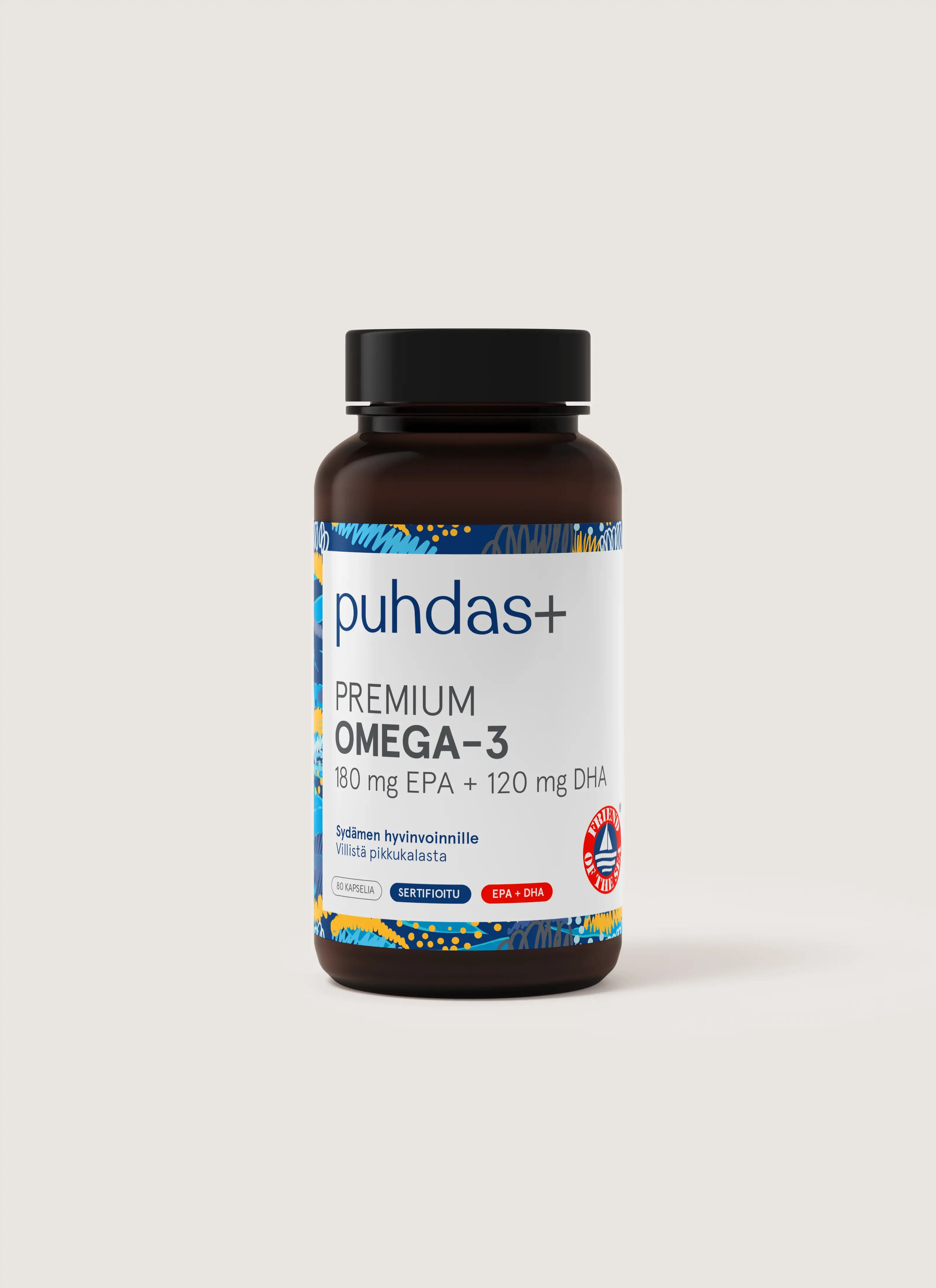 Sydämen hyvinvoinnille! Puhdas+ Premium Omega-3 on laadukas ja sertifioitu kalaöljy. Tuotteesta saat EPA- ja DHA-rasvahappoja samassa suhteessa kuin ne ovat luonnollisessa kalaöljyssä. Rasvahapot ovat luonnollisessa, hyvin imeytyvässä triglyseridi-muodossa. Puhdas+ Premium Omega-3 -valmisteen tuotannossa käytetään villiä pikkukalaa, joka on kalastettu Etelä-Tyynenmeren saastumattomilta vesiltä.