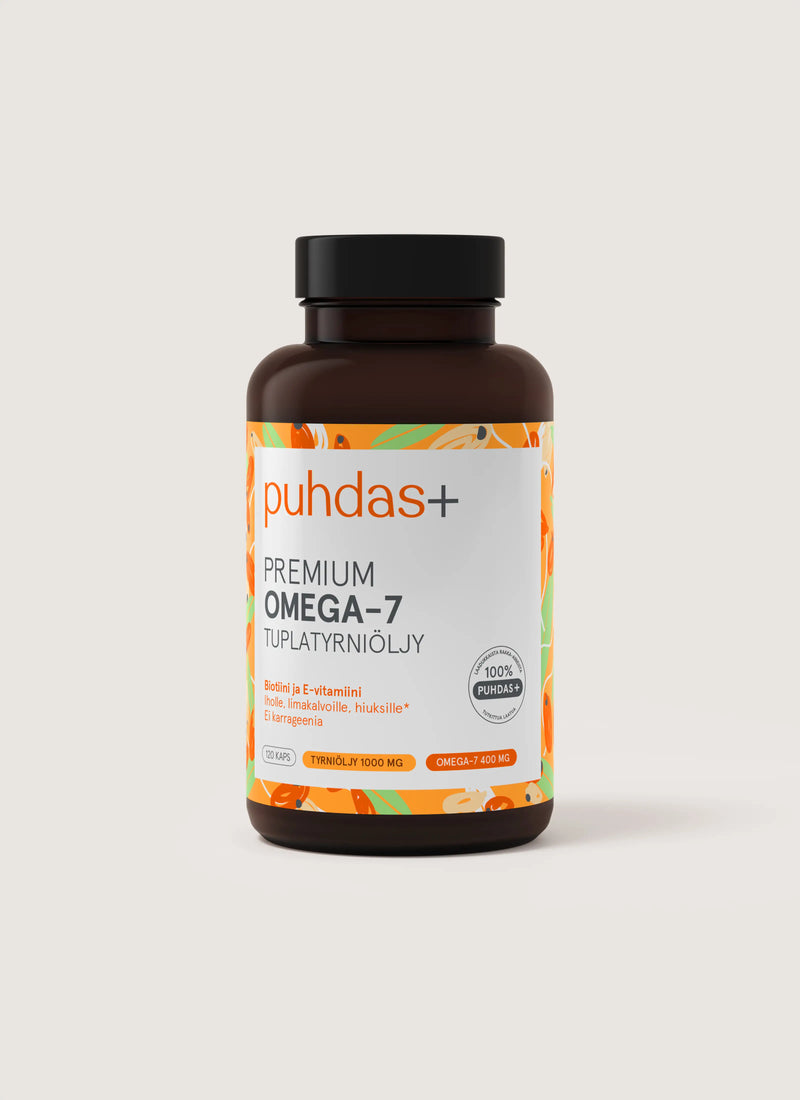 Puhdas+ Premium Omega-7 on vahva ja puhdas tuplatyrnivalmiste, joka sisältää tyrniöljyn arvokkaat ainesosat sekä siemenistä että hedelmästä. Puhdas+ Premium Omega-7 on tuotettu hellävaraisella hiilidioksiuutolla, joka takaa puhtaan ja laadullisesti parhaan tyrniöljyn 100 % luonnollisessa muodossa. Tuote ei sisällä karrageenia, väriaineita eikä nauta/sikaliivatetta.