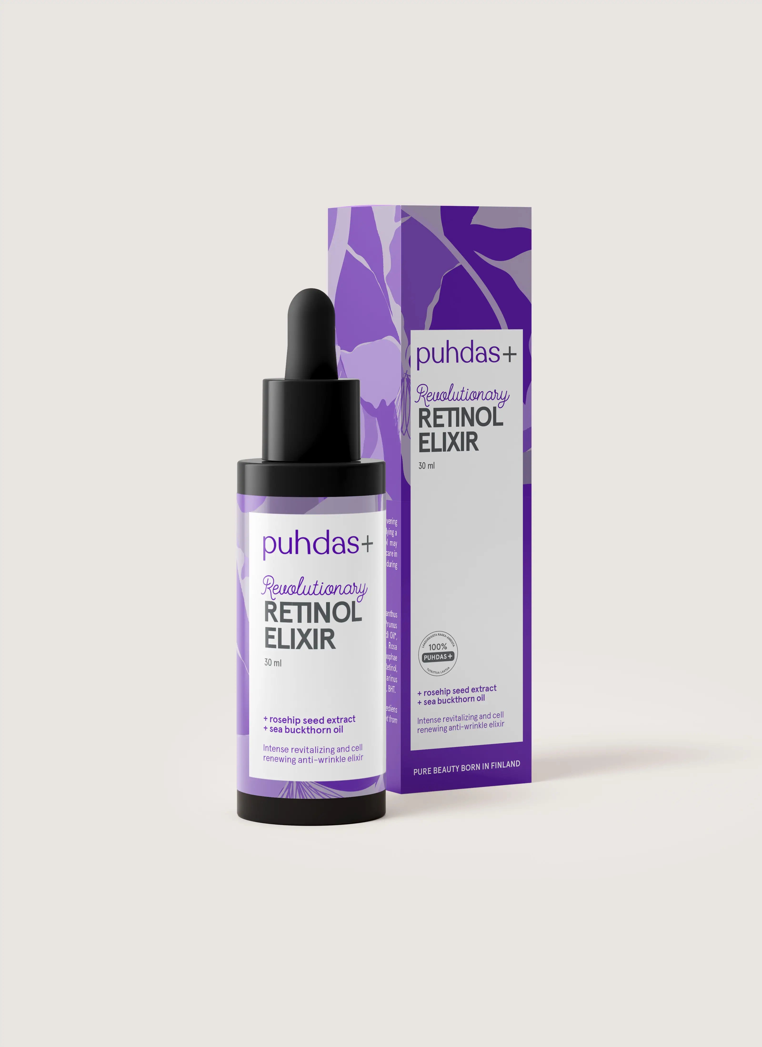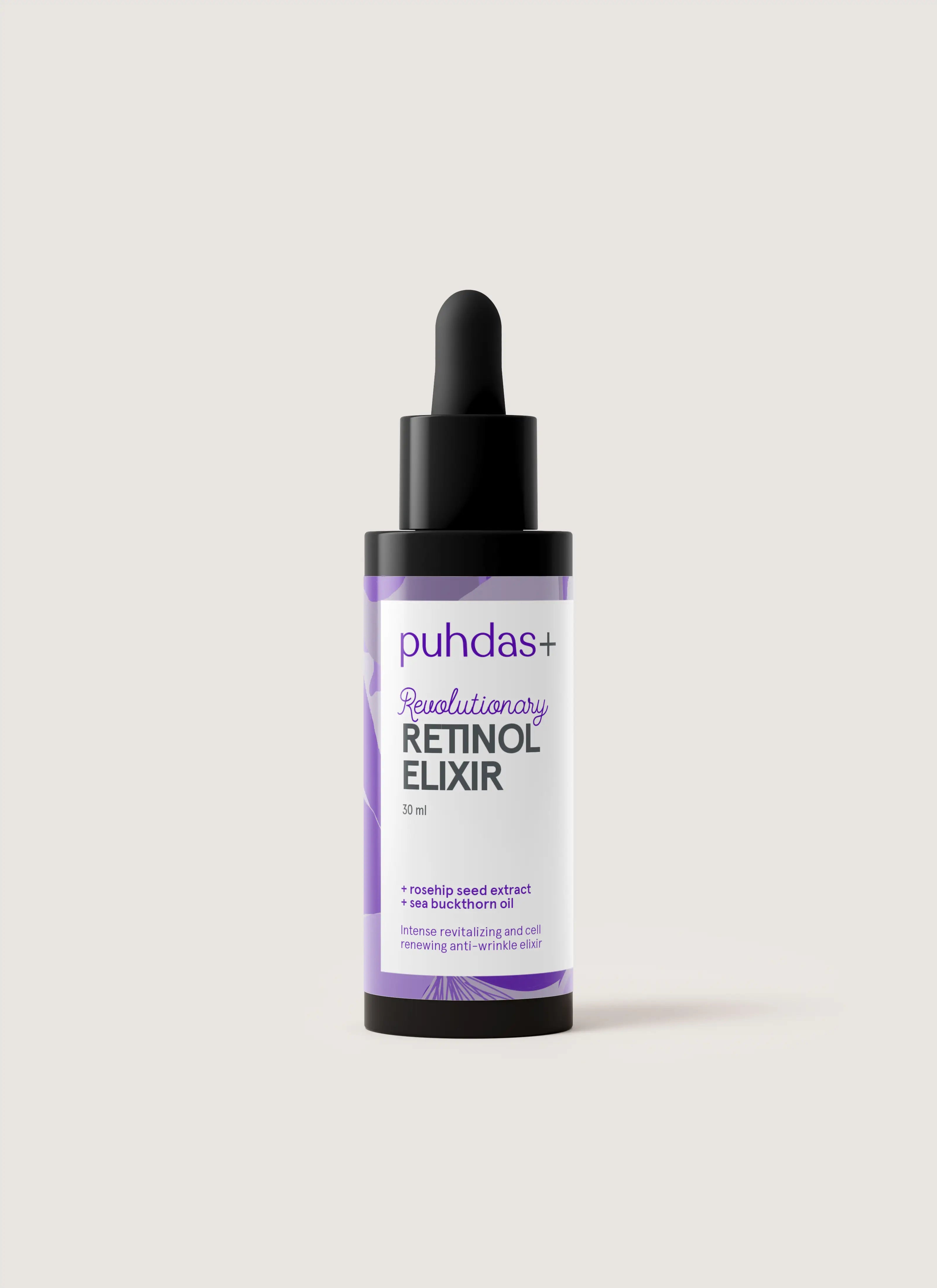 Puhdas+ Revolutionary Retinol Elixir on voimakkaasti elvyttävä ja soluja uudistava, sekä ryppyjä ehkäisevä eliksiiri. A-vitamiinipohjainen retinoli kirkastaa ja uudistaa ihoa sekä vahvistaa ihon kollageenin tuotantoa tehden ihosta kiinteämmän. Yhdessä ruusunmarja-uutteen kanssa seerumi pitää ihon kuulaana ja kirkkaana vahvistamalla solujen uudistusprosessia. Tyrniöljy kosteuttaa tehokkaasti ja rosmariiniuute rauhoittaa. Luomulaatuiset manteli- ja auringonkukan siemenöljyt hoitavat ihoa. Valmistettu Suomessa EcoCert-sertfioidussa tehtaassa.