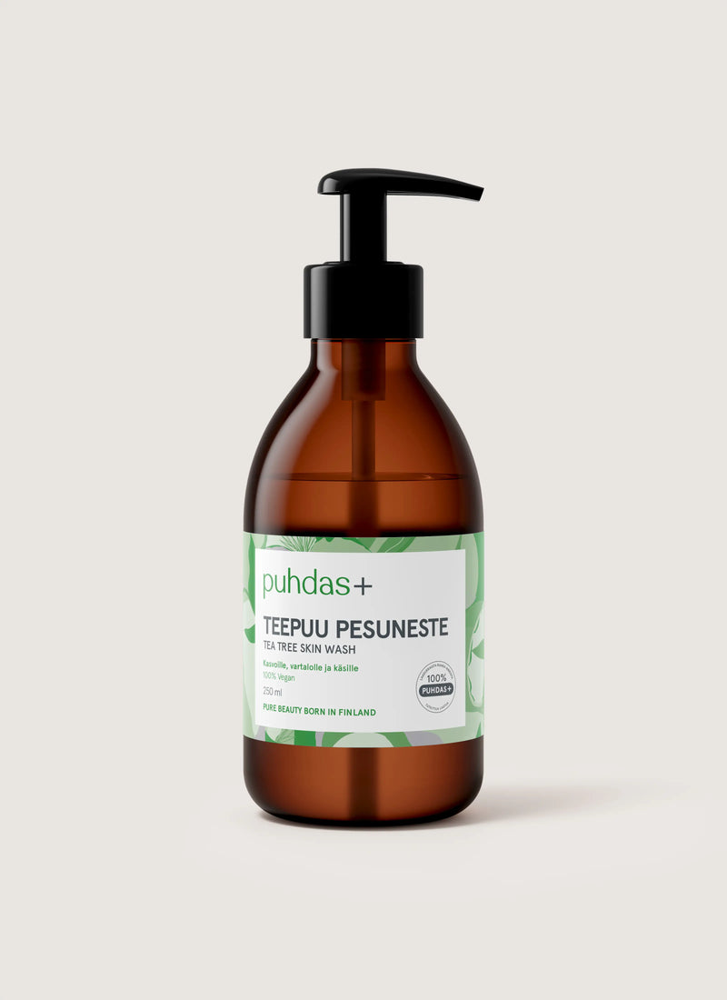 Puhdas+ Tea Tree Skin Wash on täydellinen pesuneste käsille, kasvoille ja vartalolle. Sisältää antiseptistä teepuuöljyä, joka puhdistaa ja hoitaa ihoa, mutta ei kuivata sitä. Teepuu on pieni pensaskasvi, joka kasvaa trooppisessa ilmastossa. Teepuun voimakas suosio perustuu sen tehokkaisiin puhdistaviin ominaisuuksiin. Soveltuu koko perheelle. Pakattu kätevään ja hygieeniseen pumppupulloon.
