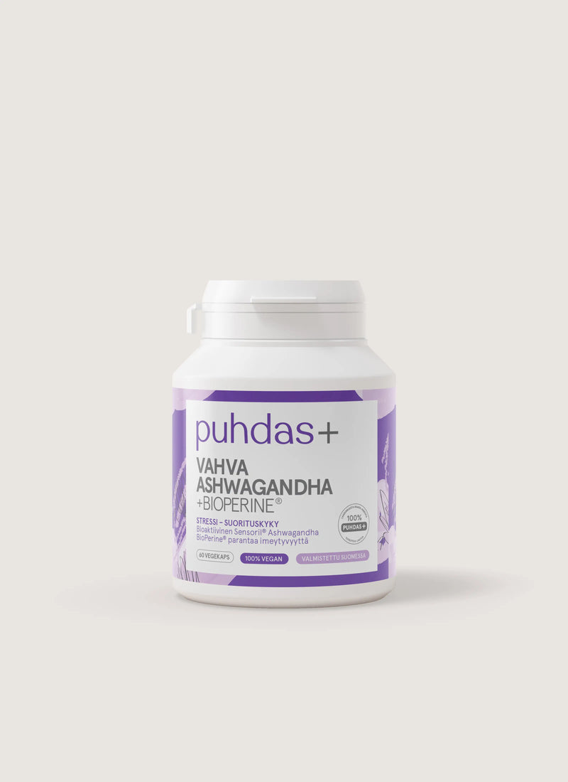 Suomessa valmistettu Puhdas+ Ashwagandha + Bioperine® sisältää patentoitua Sensoril®- ashwagandhaa, jota viljellään kestävän kehityksen mukaisesti sertifioiduilla perhetiloilla Intiassa. Standardoitu uute valmistetaan täysin ilman kemikaaleja 100% vesiuuttona. Ashwagandha auttaa edistämään stressinsietokykyä sekä parantamaan suorituskykyä ja henkistä tasapainoa. Sisältää myös patentoitua Bioperine® –mustapippuriuutetta, joka tehostaa ashwagandhan imeytymistä.