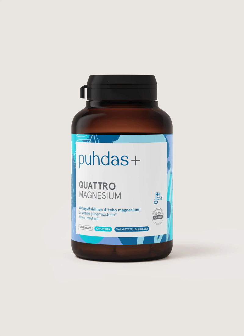 4-teho magnesium! Quattro magnesium sisältää ainutlaatuisen yhdistelmän neljää tehokasta magnesiumin muotoa; merimagnesiumia, magnesiumsitraattia, -tauraattia ja -malaattia. Magnesium edistää lihasten ja hermoston normaalia toimintaa sekä auttaa vähentämään väsymystä ja uupumusta. Hyvin imeytyvä ja vatsaystävällinen valmiste. Valmistettu Suomessa.