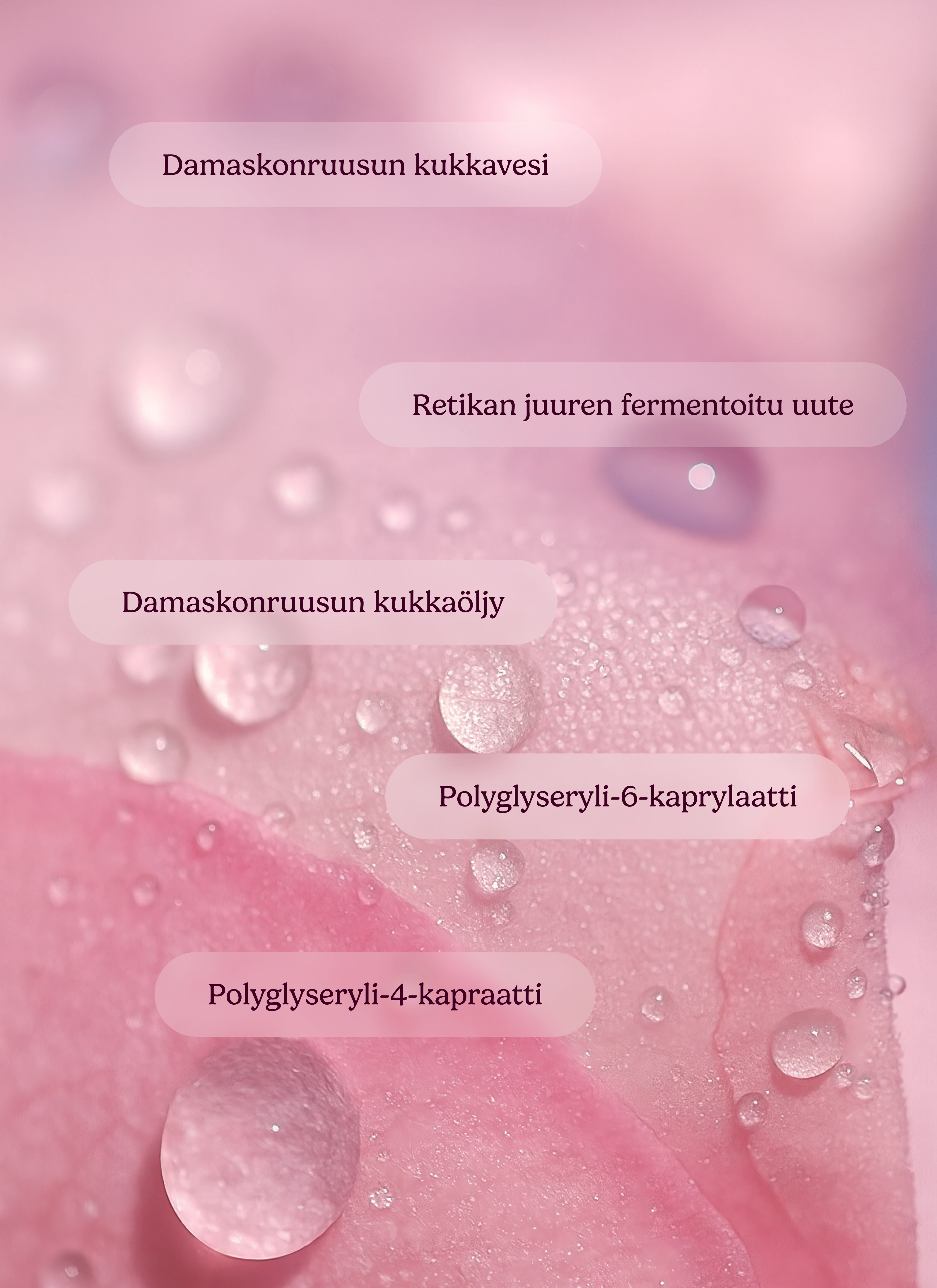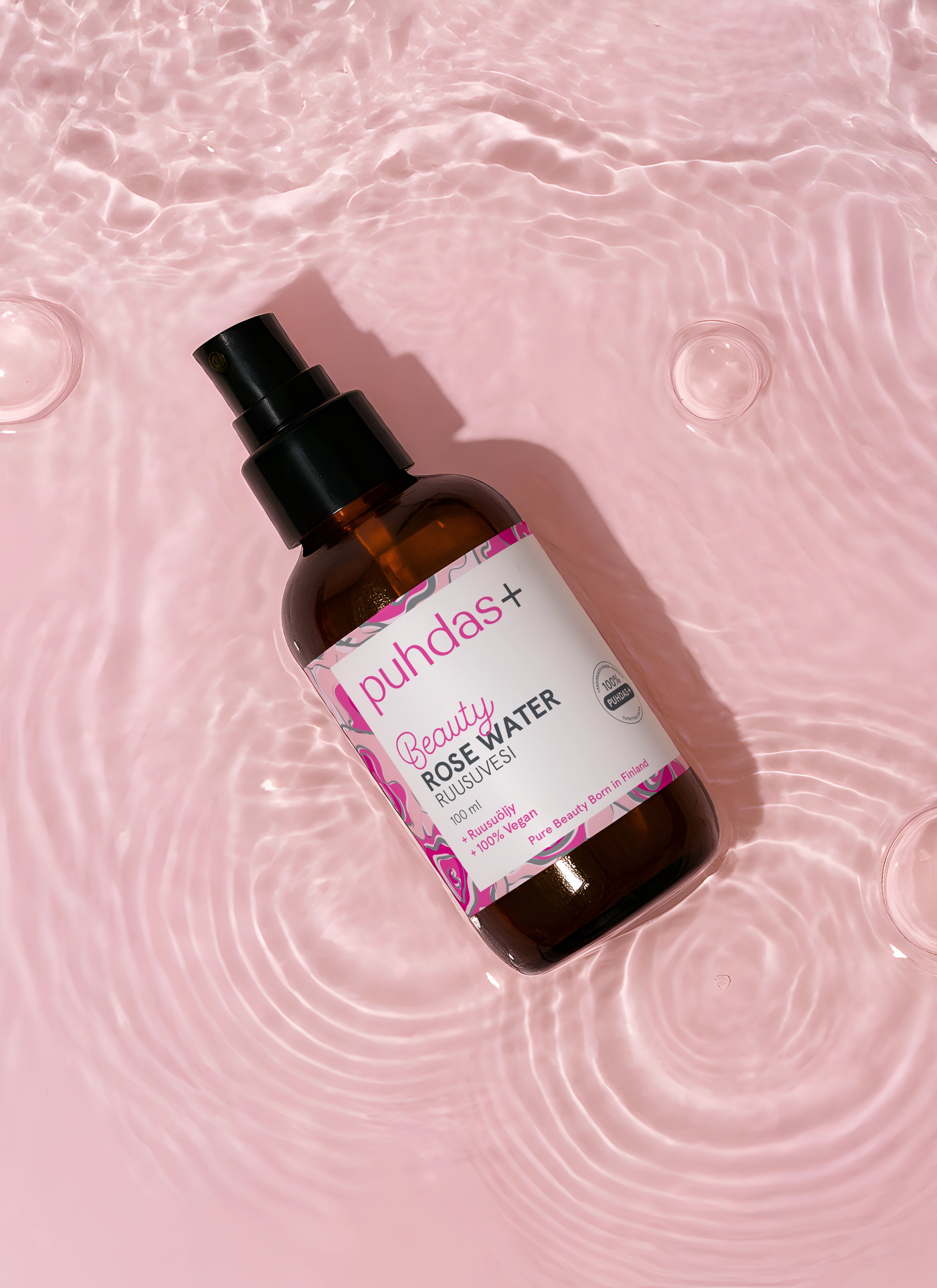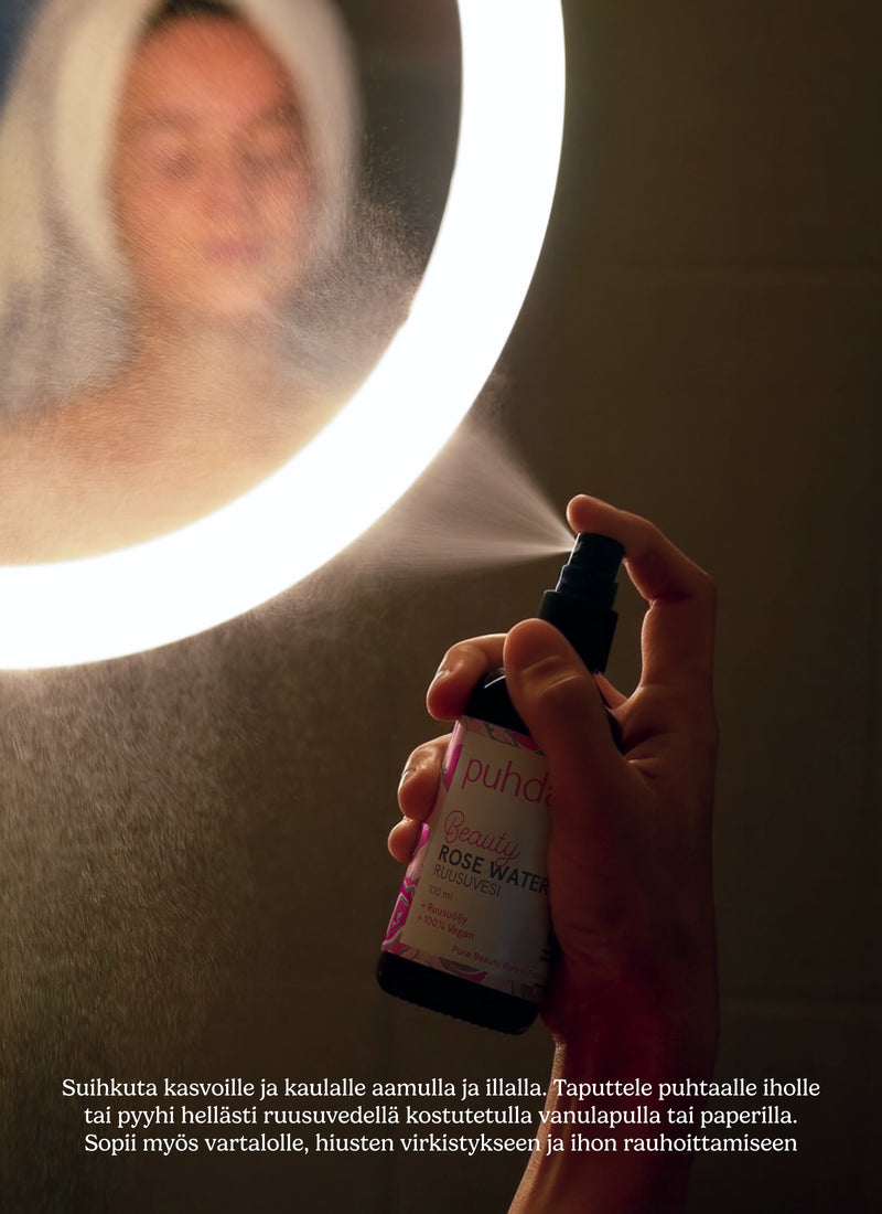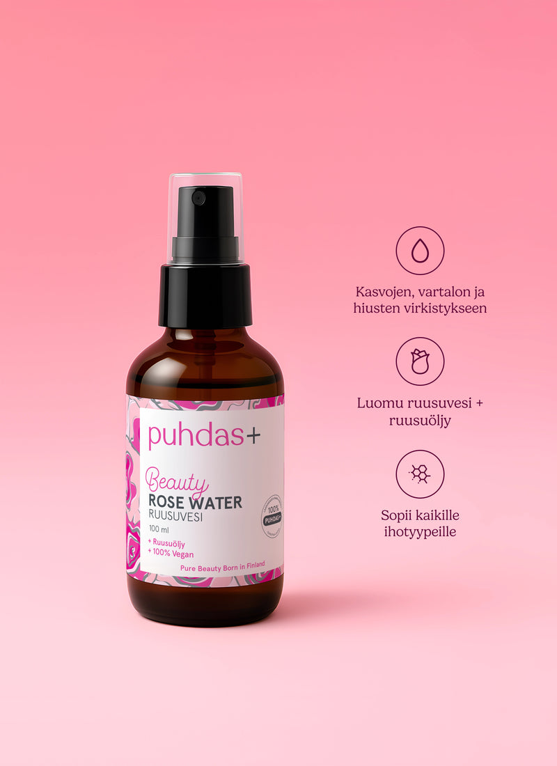 Puhdas+ Beauty Ruusuvesi kosteuttaa ja uudistaa! Ihoa ja sen väriä tasapainottava ruusuvesi sopii kaikille ihotyypeille, erityisesti kuivalle, herkälle ja ikääntyvälle iholle. Ruusuvesi rauhoittaa, raikastaa ja kirkastaa. Ruusuvesi sisältää myös eteeristä ruusuöljyä, joka täyteläistää koostumusta ja hurmaa hienostuneella tuoksullaan. Puhdas+ Beauty Ruusuvesi tukee ihon uusiutumista sekä parantaa sen sävyä.