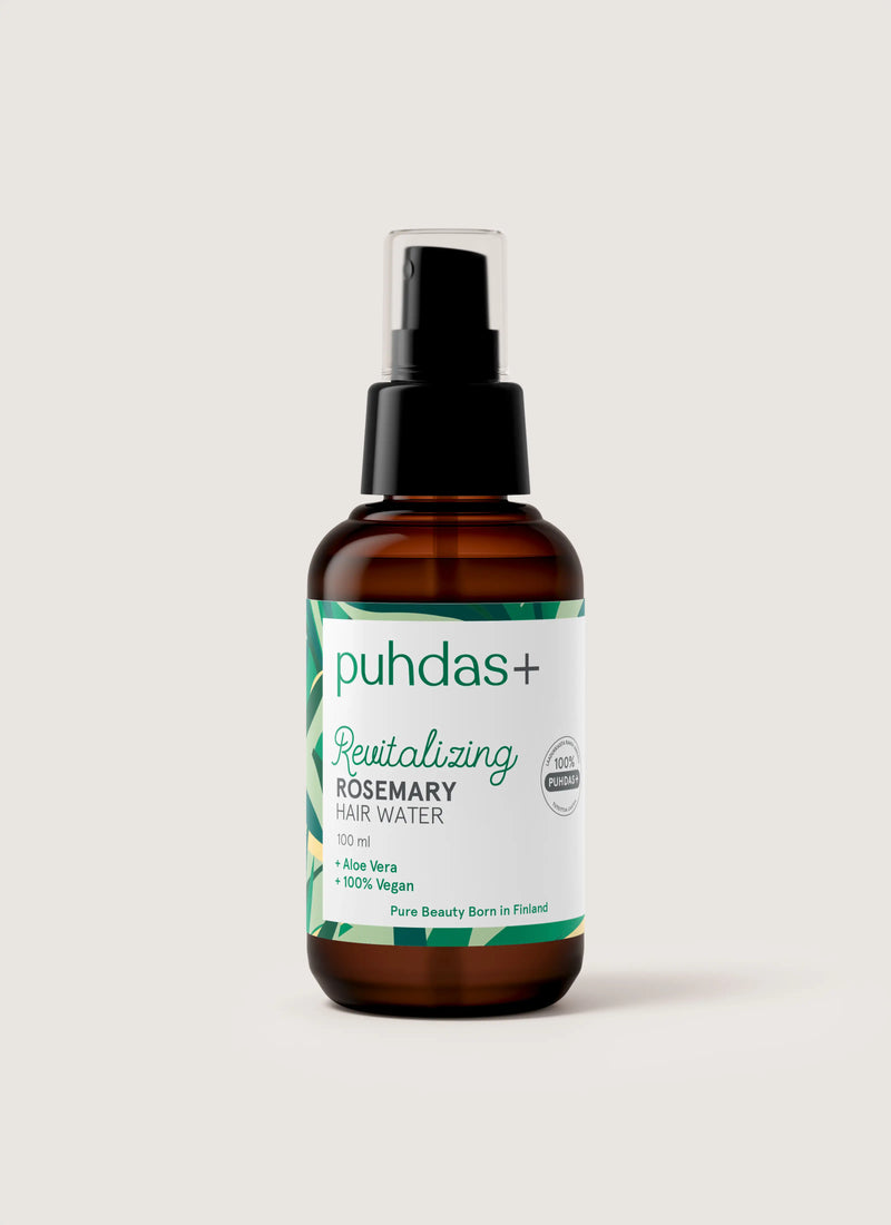 Rosmariinia ja Aloe Veraa sisältävä Puhdas+ hiusvesi kosteuttaa kuivia hiuksia sekä auttaa säilyttämään terveen hiuspohjan. Rosmariini tehostaa hiusten kasvua ja tekee hiuksista elinvoimaiset.