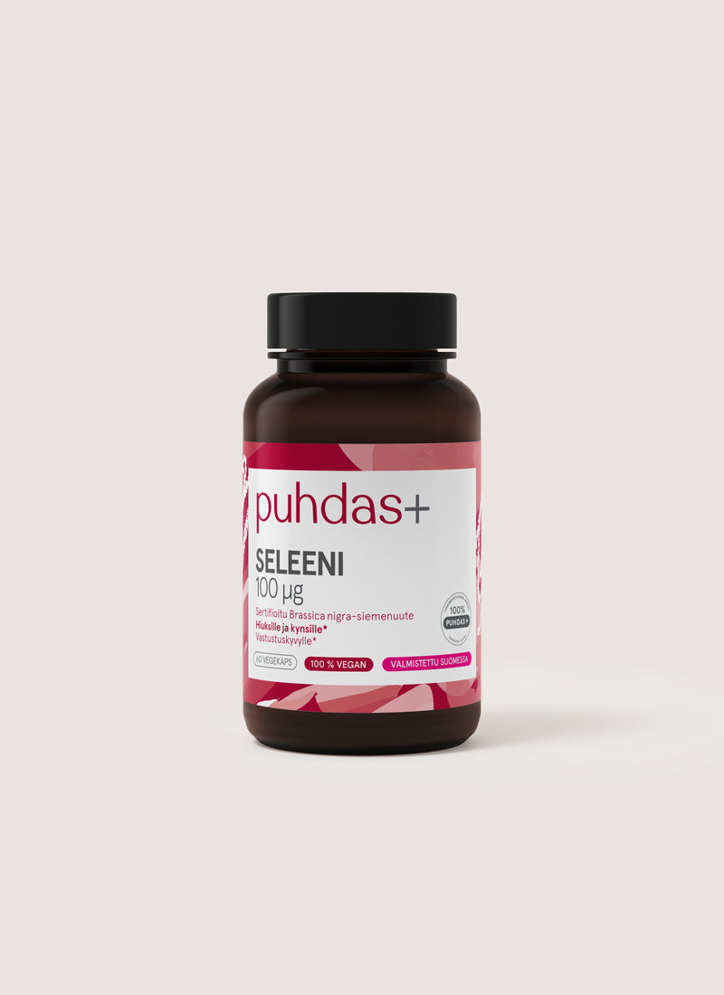 Puhdas+ Seleeni sisältää sertifioitua Brassica nigra-siemenuutetta, joka on erinomainen seleenin lähde. Seleeni edistää hiusten ja kynsien pysymistä normaaleina sekä immuunijärjestelmän normaalia toimintaa.