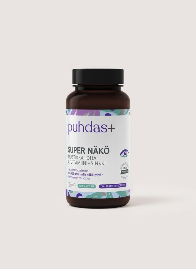 Puhdas+ Super Näkö on monipuolinen valmiste silmien hyvinvointiin! Kapselit sisältävät kotimaista mustikkajauhetta, DHA:ta sisältävää leväjauhetta, sekä A-vitamiinia ja sinkkiä