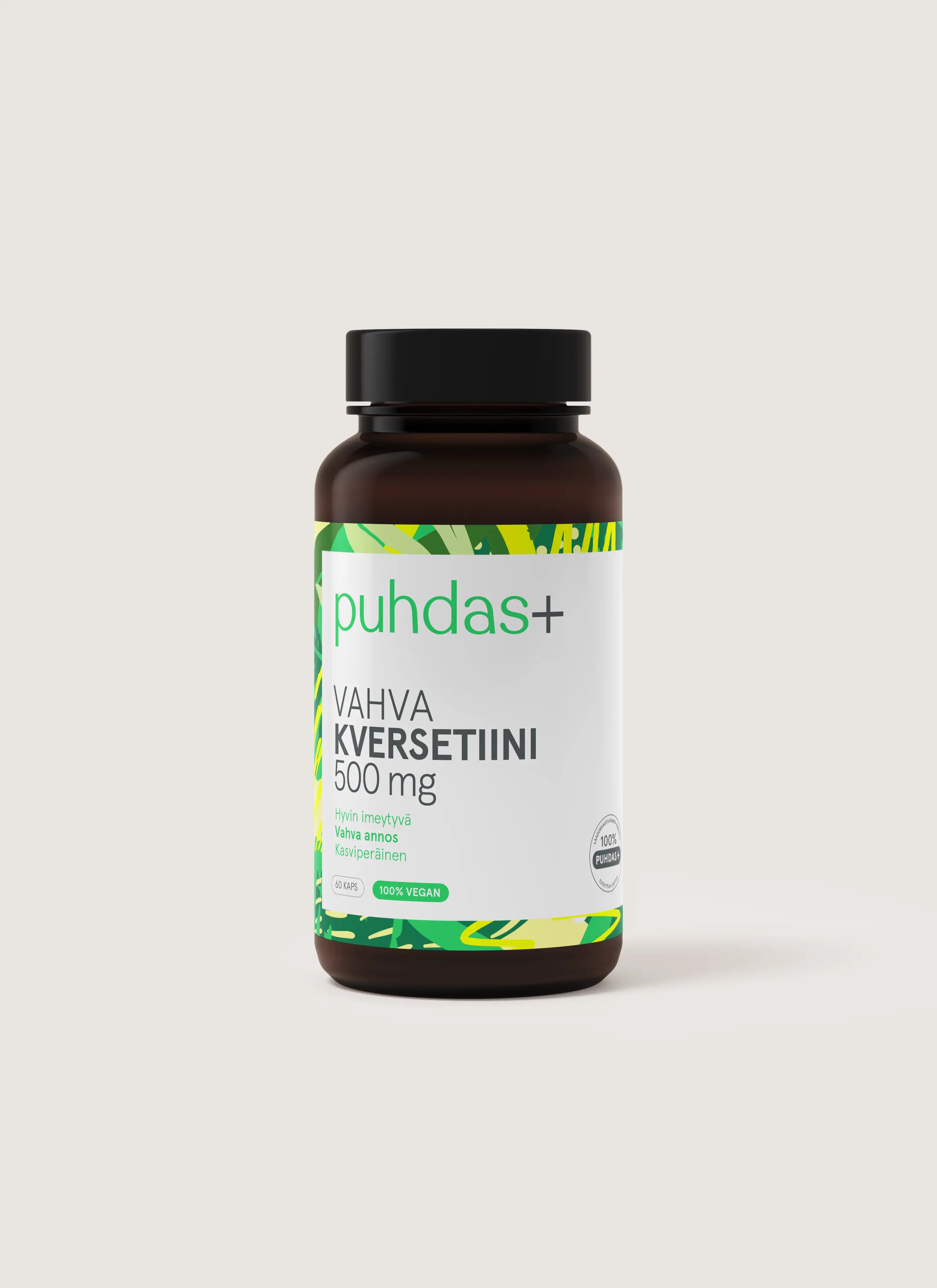 Puhdas+ Kversetiinivalmiste sisältää vahvan annoksen kasviperäistä kversetiiniä. Kversetiini on luonnollinen pigmentti, jota esiintyy monissa hedelmissä ja vihanneksissa. Se on vahva antioksidantti.